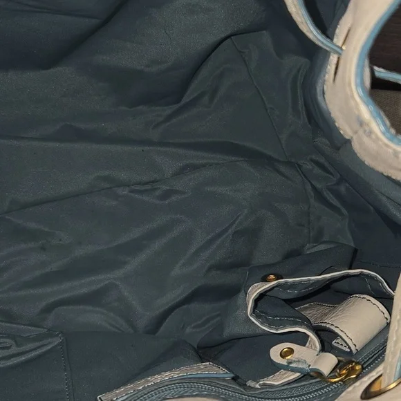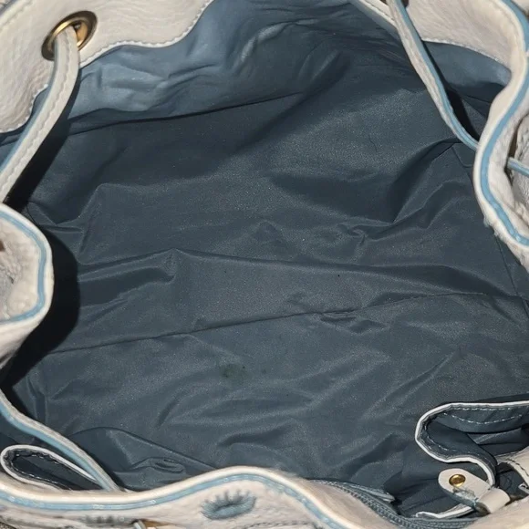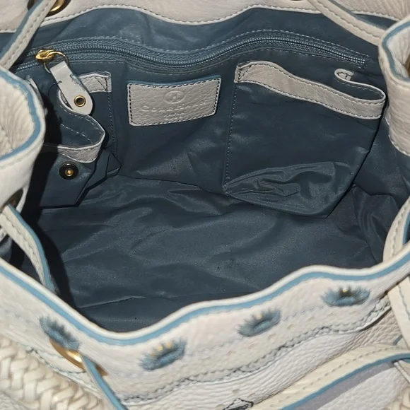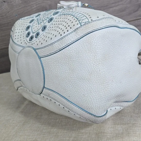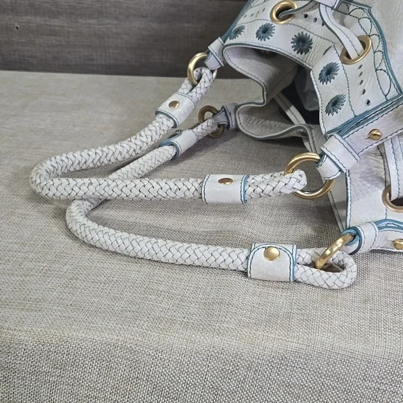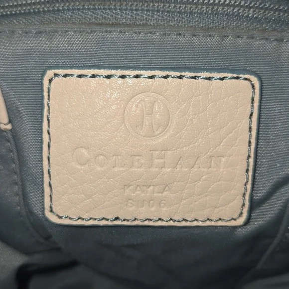 Cole Haan Kayla White Embellished Leather Satchel Shoulder Bag.Bag is in very good used condition. No rips. Beautiful bag. Item has a few light hard to see scuffs and marks. Gold tone brass hardware. Drawstring closure. Measures - 14"W x 9"H x 7"D - strap drop 9".Pet and Smoke free home.Please look at all pictures.Comment with any questions.Thank you