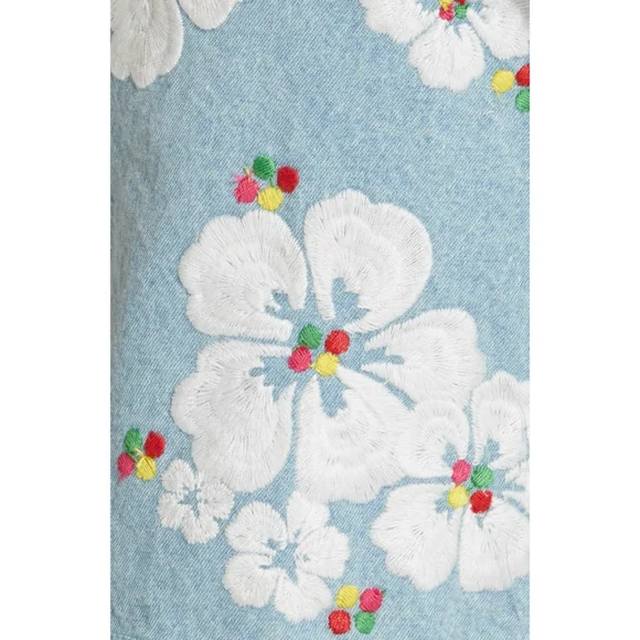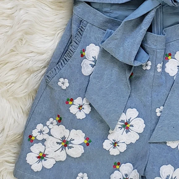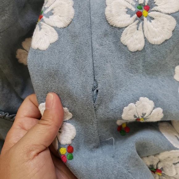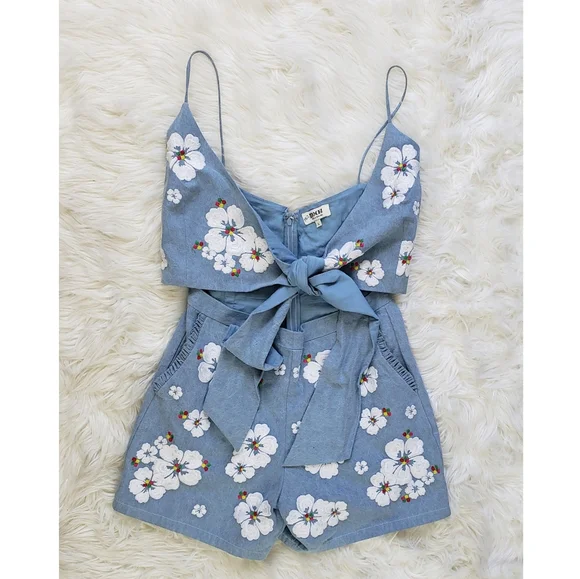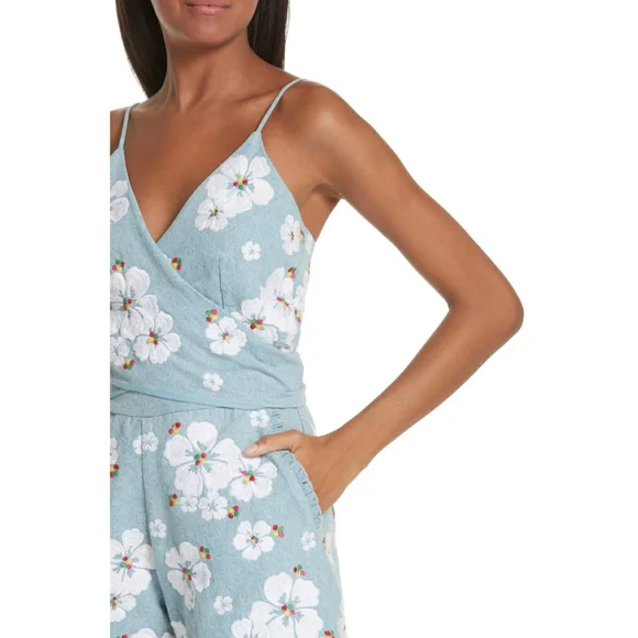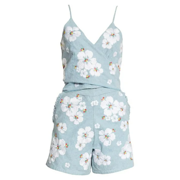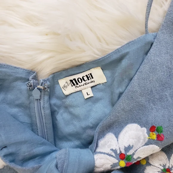 All Things Mochi Gala Embroidered Summer Comfy RomperEmbroidered hibiscus detailsRuffle trimmed pocketsSurplice v-neck Spaghetti strapLinedBack zipperSize largePre-owned in good condition with seam came undone in the zipper area.Pit to pit 17"Waist 29.5"Offers welcome!Come by my closet for more women and men fashion that includes cute punk, boho, summer, winter, oversized, retro, western, party, prom, modern, cocktail, knit, flowy, plus size pieces.