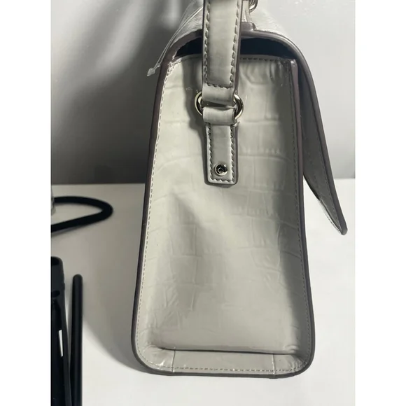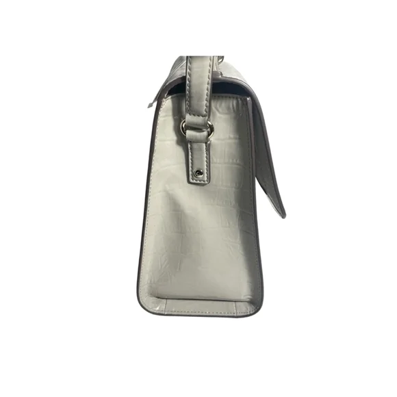 This Kate Spade New York satchel is light grey with a crocodile embossed pattern. It features a top handle and an adjustable (not removable) crossbody strap. The material appears...