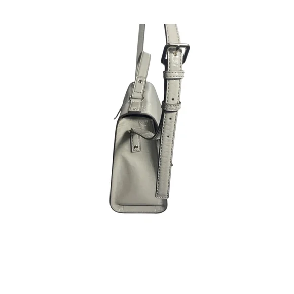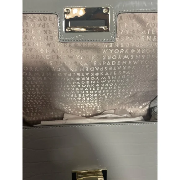 This Kate Spade New York satchel is light grey with a crocodile embossed pattern. It features a top handle and an adjustable (not removable) crossbody strap. The material appears to be leather or a leather-like material. Not sure which. It has a flap closure with a gold-toned clasp. The interior is lined with a signature Kate Spade print. The bag is new but shows a minor surface scuff on the front. The overall condition is described as New With Defects.