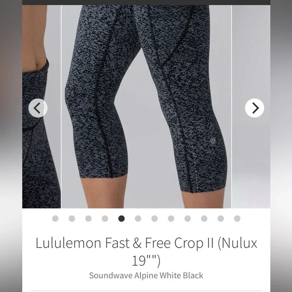 Lululemon Fast and Free Crops Sz 8 w Pockets on legs EUCSound wave Alpine Black White19” inseamReflective details Clean. Excellent condition!!!!Feel fast and free in these barely there, sweat-wicking run crops. Made with Nulux™ fabric that is quick-drying, sweat-wicking, and offers lightweight coverage.nulux™Nulux™ fabric is quick-drying, sweat-wicking, and offers lightweight coverage1 1 3 5