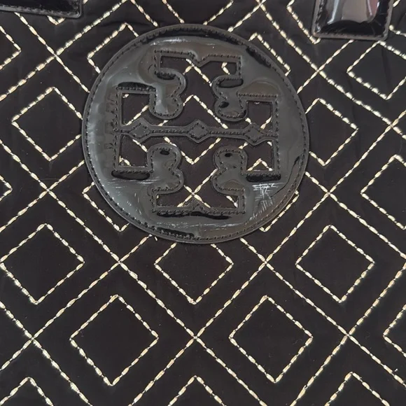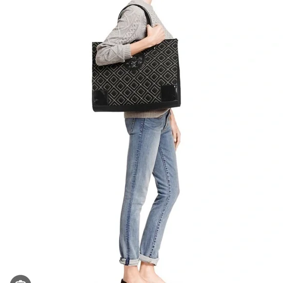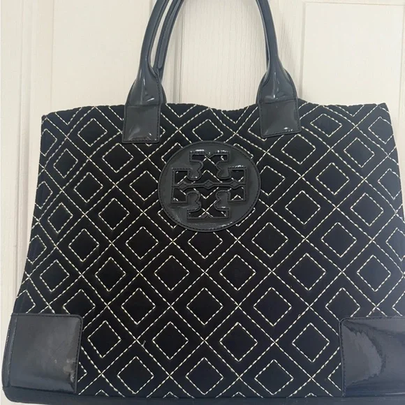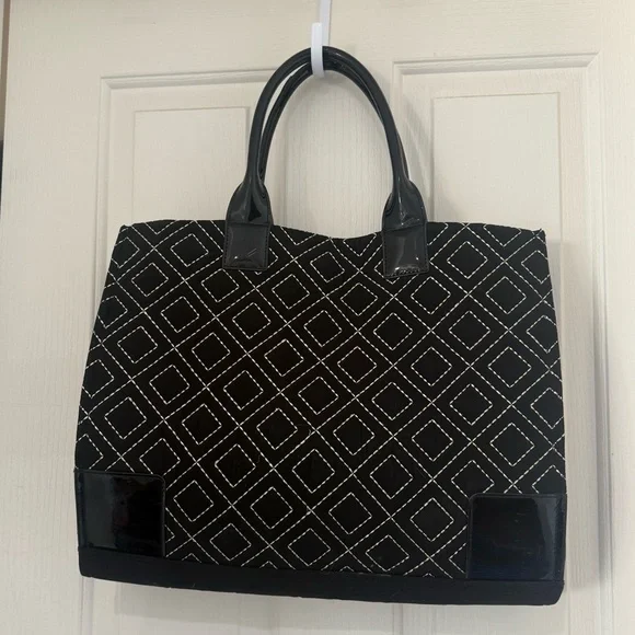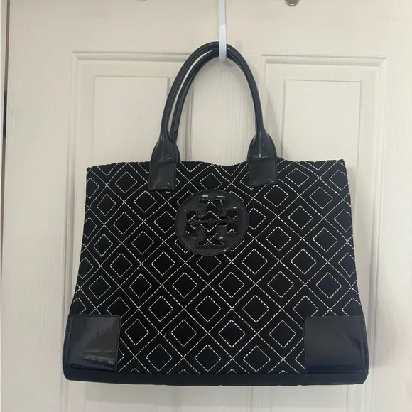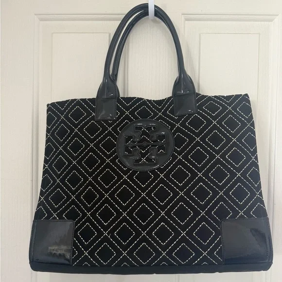 Tory Burch Ella Qulited Black Tote Bag Travel Expandable Large Designer Luxury