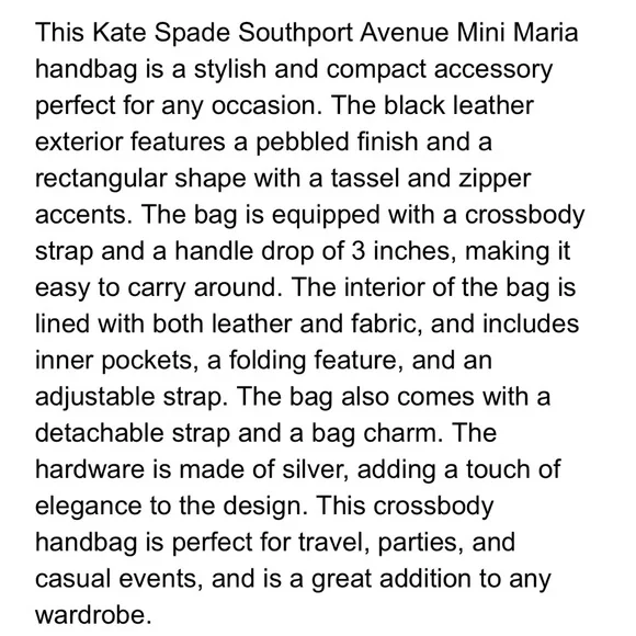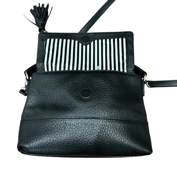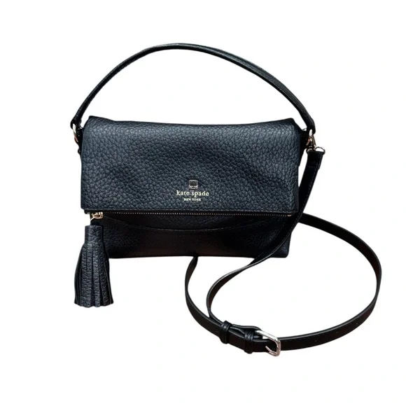 The Kate Spade Black Crossbody Bag combines elegance and functionality with its sleek design and silver-toned hardware. Crafted from high-quality materials, it features a foldover top and a stylish tassel accent, making it perfect for both casual outings and sophisticated events.Please refer to all photos for full details.Smoke free home Approximate Measurements W-11”x H-8.5”x D-4”Fast shipping