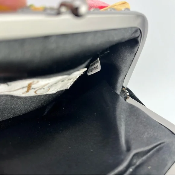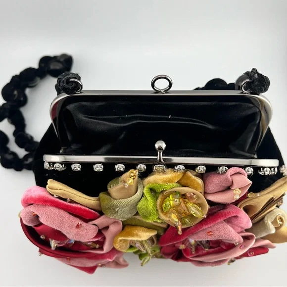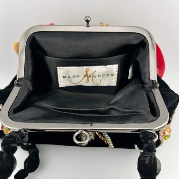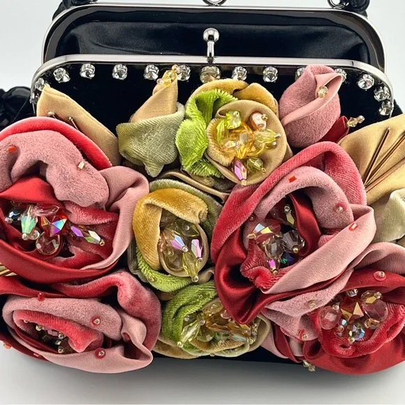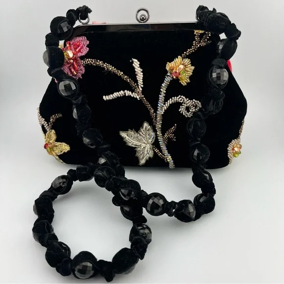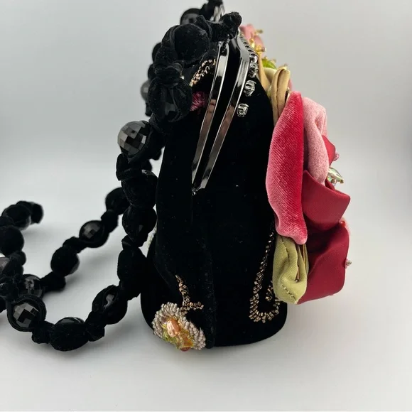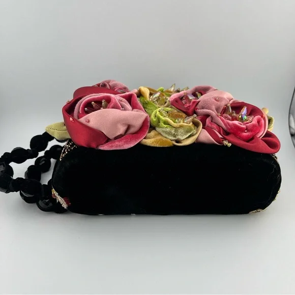 Retired Mary Francis Black Multi Color Velvet Beaded Rose Silk Flower Shoulder Bag Purse - this bag is a wearable piece of work. The craftsmanship is whimsy! Detail on the back and front of the handbag!! Handcrafted Beadwork & Embellishments Meticulously hand-beaded with tiny seed beads, crystals, and luxe fabrics, every bag showcases intricate detailing. Features 3D floral appliqués, embroidery, and textured layering.Mary Frances Black Multi-Color Velvet Beaded Rose Shoulder BagA stunning fusion of elegance and whimsy, this handcrafted purse features a lush black velvet base adorned with intricate beadwork and silk floral appliqués in rich red and pink tones. The dimensional rose motif adds romantic flair, while the structured silhouette and glossy beaded strap elevate its sophistication. Ideal for evening wear or special occasions, this bag is a statement piece that blends artistry with function.Material: Velvet with silk flower accents and hand-applied beadsColor: Black base with multi-color floral detailing (red, pink, hints of green)Strap: Beaded shoulder strap encased in velvetClosure: Kiss-lock Excellent preloved condition Purse is: 7" W5" H3" DStrap is 28"