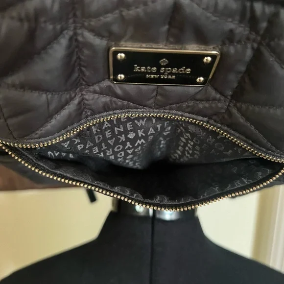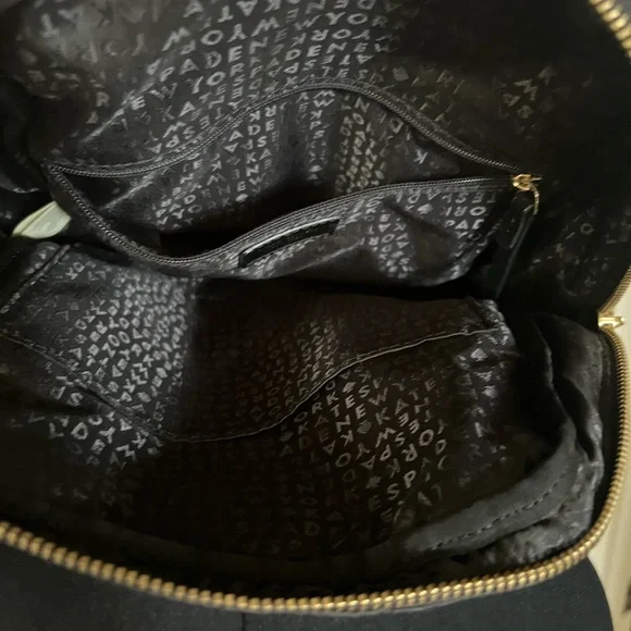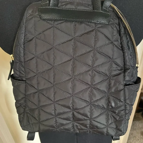 Stylish black quilted backpack by Kate Spade. Features a front zip pocket and side pockets.