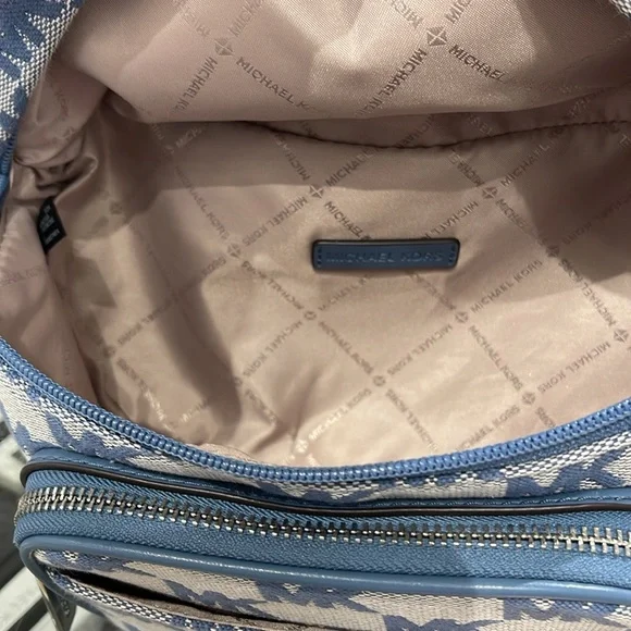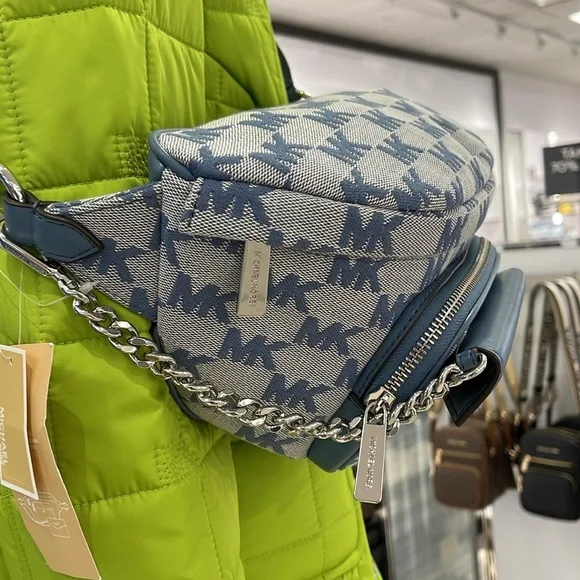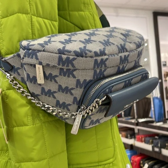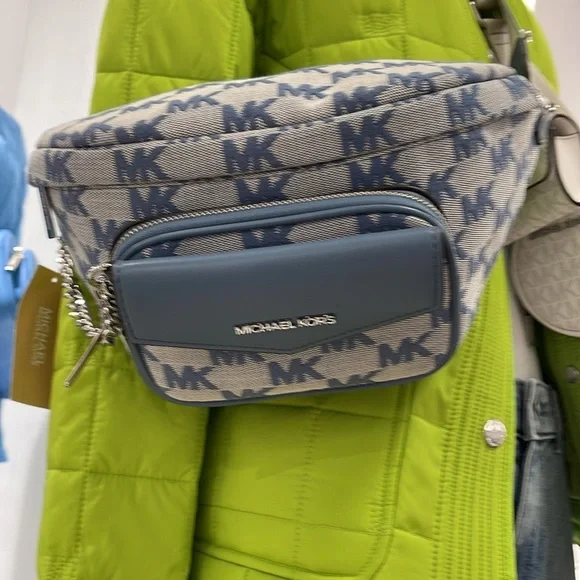MICHAEL KORSMaisie Large Logo 2-in-1 Sling Waist Fanny Pack Crossbody Denim/silverNWT New with the tag authentic Maisie waist pack is a street-chic essential for off-duty days. Crafted from Signature-print canvas, this clever 2-in-1 style includes a faux leather card case that slides neatly into the front pocket to look like an integrated part of the design. Attached by a chain strap, it can be removed and carried solo when you’d rather travel light.• 2-in-1 sling pack • Logo jacquard/woven• Fabric 1: 89.4% coated canvas/9.6% polyester/1% polyurethane • Fabric 2: 88.92% coated canvas/11.08% polyester • Trim: 52% polyurethane/48% polyester • Silver tone hardware • 11”W X 5.25”H X 3.75”D • Adjustable strap: 19.5”- 21.5” • Exterior details: front zip and slip pockets • Interior details: back slip pocket • Removable card case: 5.75”W X 3.25”H X 0.5”D • Lining: 100% polyester • Zip fastening • Imported MICHAEL KORSMAISIE355485MN7JLG 2IN1 WAISTPACK