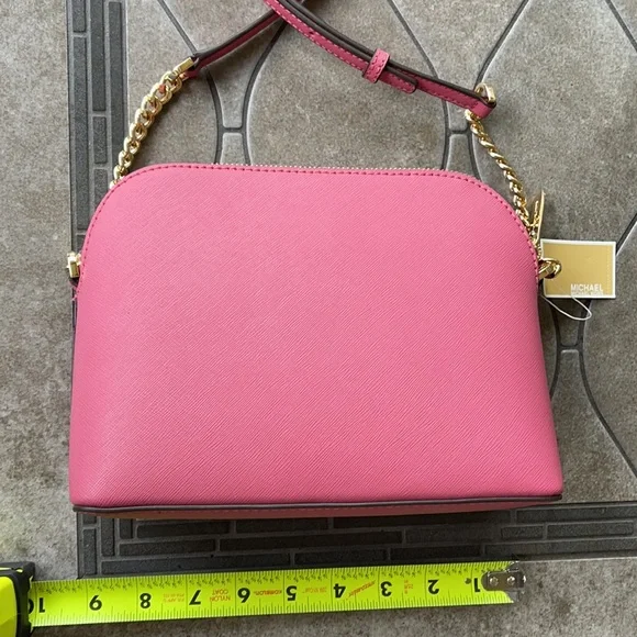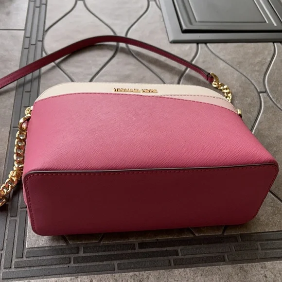 Michael Kors Jet Set Travel Medium Dome Crossbody Rosewood Leather Color: Rosewood MultiModel: 35H1GTVC6L(W) 8 5/8" at bottom(H) 6 3/4"at center - tallest point(D) 3 1/2"Strap Drop: 21.5" - 24"Retail Price: $328.00 USDRosewood, Optic White and Powder Blush saffiano leather in colorblock patternClosure: Top ZipStrap: Rosewood saffiano leather and gold chain Hardware: GoldStitching: Rosewood/Optic White/Powder Blush/BeigeGold "MICHAEL KORS" in block lettersOpen slip pocket on frontLining: Beige MK sateenInterior: Open w/ 2 open pocketsNew w/Tags