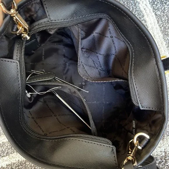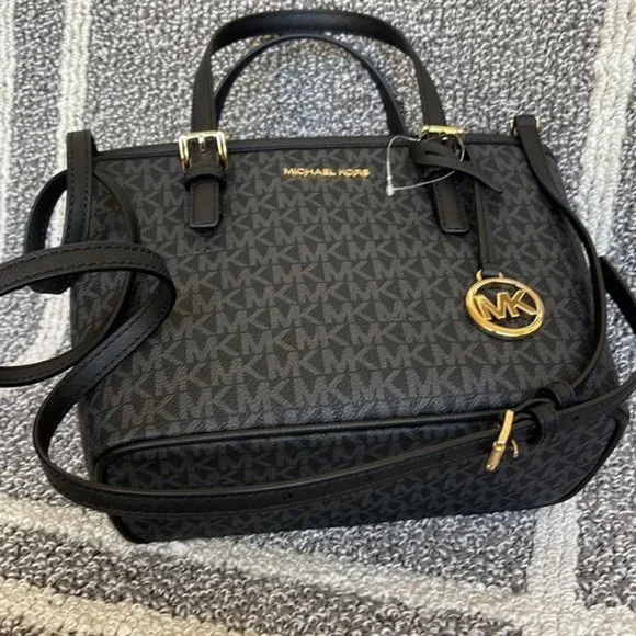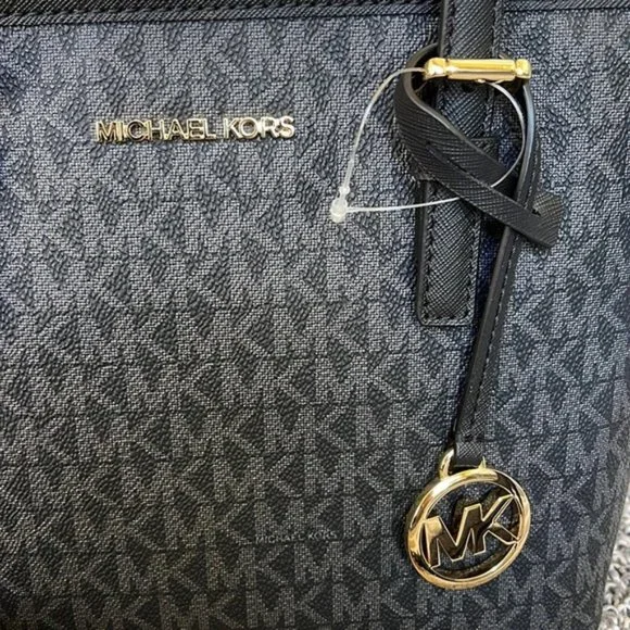Michael Kors Jet Set Travel XS Carryall Tote Top Zip Tote BlackColor: BlackGold Toned Hardware Zip Top ClosureSlip-in PocketOne MK CharmCustom Fabric Lining 1 Slip-in Pocket, 1 Zipper Pocket 9"(top) 11"(bottom) x 7.75" (H) x 4.25"(D) Strap: 5", 24"