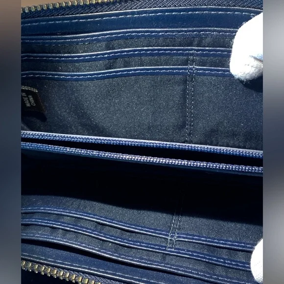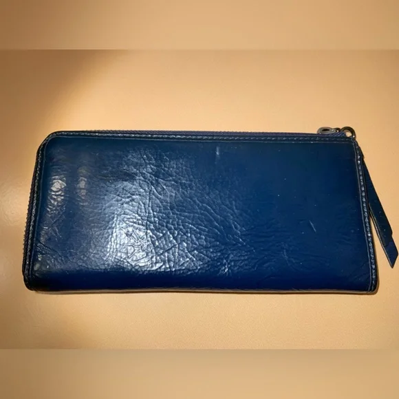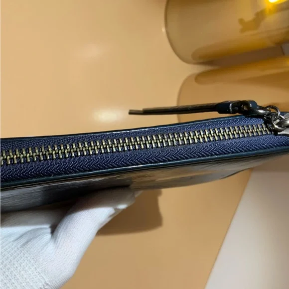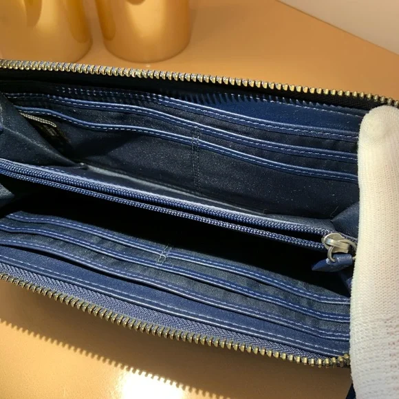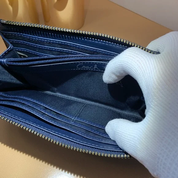 Coach Poppy Accordian Wallet EUCMidnight Blue 3- Quarter Zippered Semi--gloss exterior material Blue Lined interior 8 Card Slots4 Slip pockets and middle change pocket8”W x 4” H