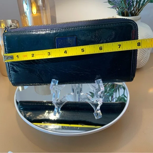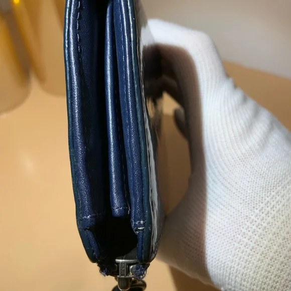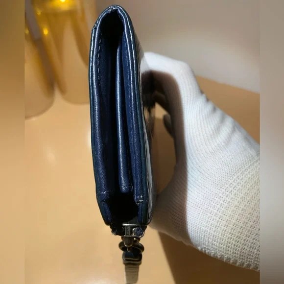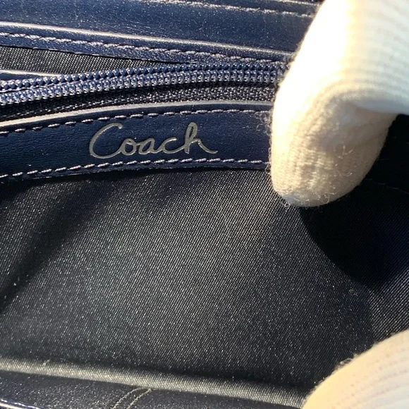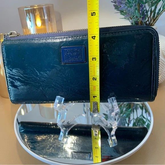 Coach Poppy Accordian Wallet EUCMidnight Blue 3- Quarter Zippered Semi--gloss exterior material Blue Lined interior 8 Card Slots4 Slip pockets and middle change pocket8”W x 4”...
