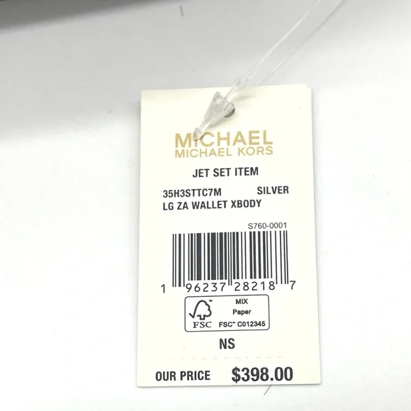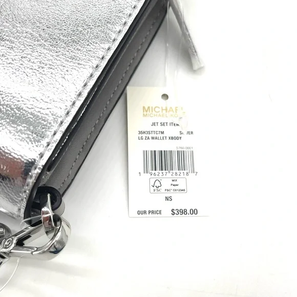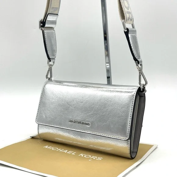 Brand New with TagMichael Kors Large Zip Around Wallet Xbody Bag Leather• Silver-tone hardware• 8”W X 5” H X 2”DSilver tone logo and hardwareColor: SilverWallet Interior details:12 card slots, 4 slip pockets, zip pouch, phone pocket• Lining: 100% polyester• Zip fastening• Imported