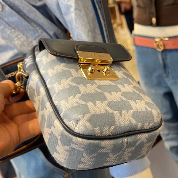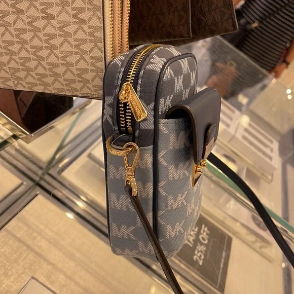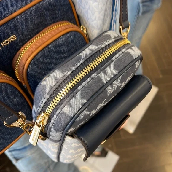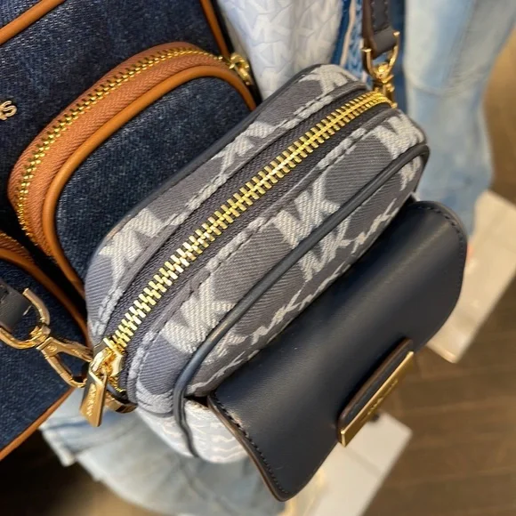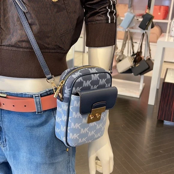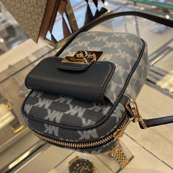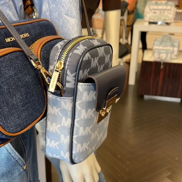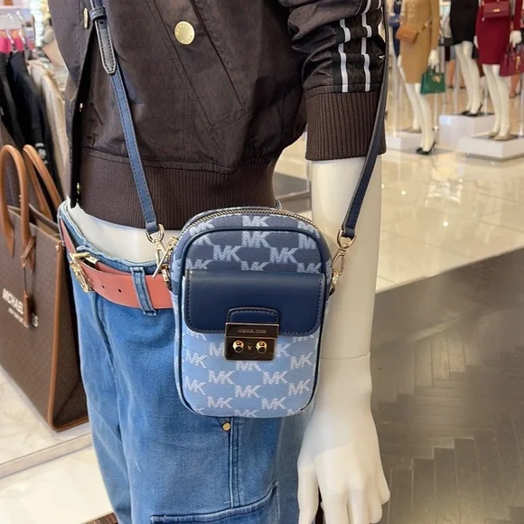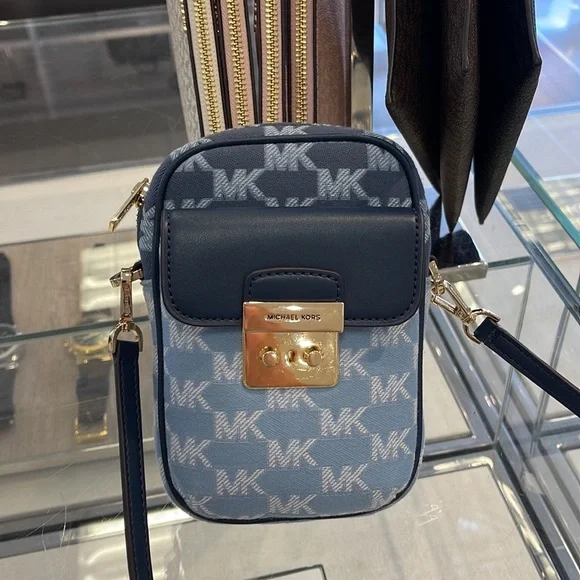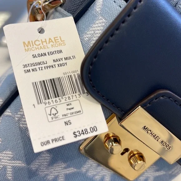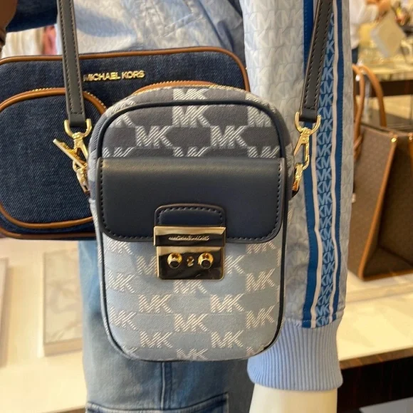 Brand New with tagMichael Kors Sloan Editor Small Phone Logo Jacquard CrossbodyColor: Navy Multi • Logo jacquard • 78.5% cotton/21.5% polyester • Trim 1: 60% polyurethane/20% cotton/20% polyester • Gold-tone hardware • 7”H X 4.5”W X 2” D• Adjustable strap: 15.75”-25” • Exterior details: back slip pockets, front pocket • Interior details: 3 cc slip pockets • Lining: 100% polyester • Imported