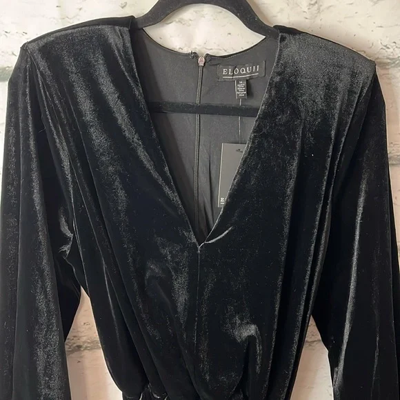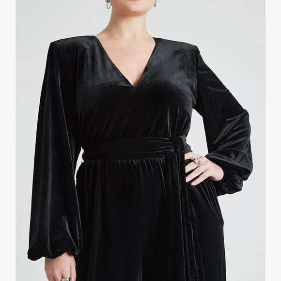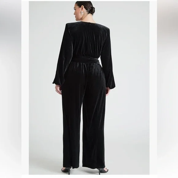 Eloquii black velvet jumpsuit. Size 14 NWTAbout this item95% Polyester 5% SpandexStretch VelvetLinedRelaxed FitSleeves with Elastic Opening.Zipper BackTie WaistPocketsDescription95% Polyester 5% Spandex Stretch Velvet Lined Relaxed Fit Sleeves with Elastic Opening Strong Shulder with Shoulder Pads Invisible Zipper In Back, Elastic at Waist Wide Leg 30" Inseam on Size 18 Machine wash cold gentle cycle with like colors. Only non-chlorine bleach when needed. Do not tumble dry. Lay flat to dry. Cool iron as neededP2P is about 22 inches and has room to stretch Inseam is about 31 1/2 inches