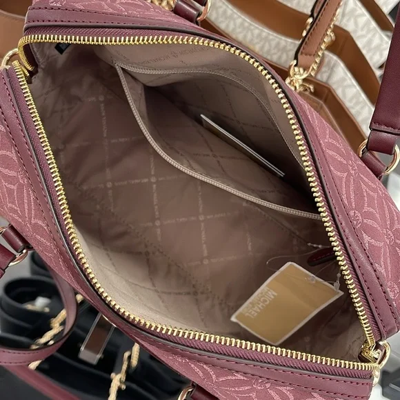 MICHAEL KORS JST TRAVEL MEDIUM DUFFLE SATCHEL SHOULDER CROSSBODY BAG MK OXBLOOD MULTI JACQUARDNWT Authentic This Michael Kors Travel duffle bag is a versatile and stylish accessory for any occasion. With a rectangular shape and coated finish, this bag features a zip closure and double handles for easy carrying. The bag is made of a combination of leather and PVC materials, and the hardware is gold-plated for a chic touch.MICHAEL KORS TRAVEL MEDIUM DUFFLE SATCHEL SHOULDERCROSSBODY BAGBROWN ABOUT THE ITEMDUFFLE BAG DETAILSPlease look at approximate dimension below before purchasing. APPROX. DIMENSIONS: Length: 11 inchesHeight: 7.5 inchesDepth: 5 inchesSize: Medium (M)Straps: 4 inchesAdjustable Strap: 18 inches to 22 inches100% Authentic Michael Kors Logo At FrontZip Top ClosureGold Toned Hardware1 Slip In Pocket At FrontCustom MK Fabric Lining1 Zipper PocketMICHAEL KORSTRAVEL35F4GTFS6J OXBLOOD MLTIMD DUFFLE SATCHEL