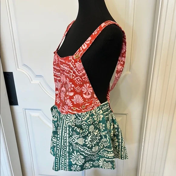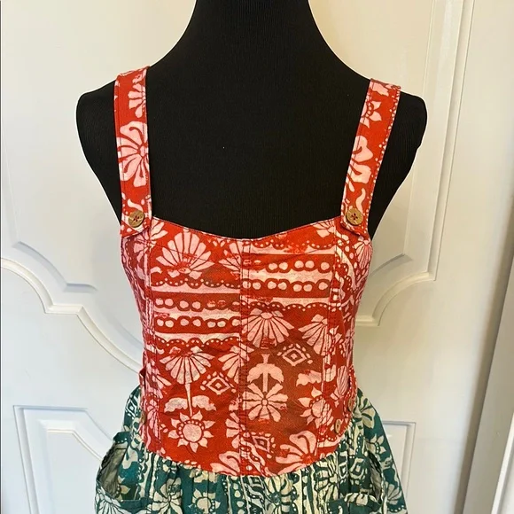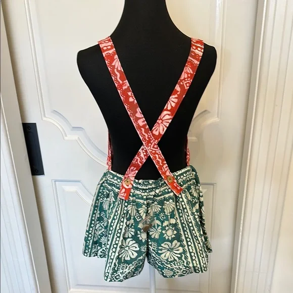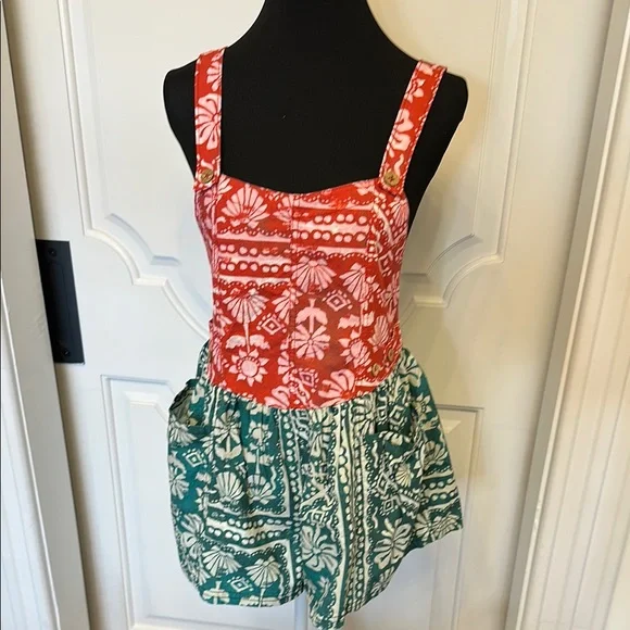 Vibrant red and green funky print romper/shortalls with a unique pattern. Perfect for summer outings. New without tags.