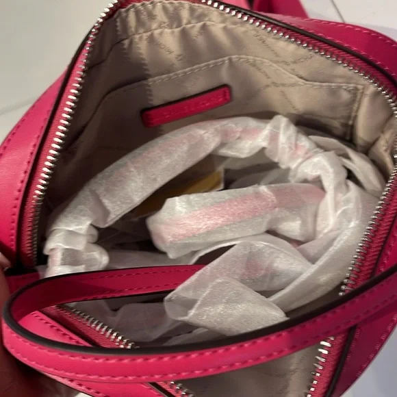 Michael Kors Jet Set Large Ombré Signature Logo East West Crossbody BodyDragonfuitNWT Authentic Crafted from ombré Signature-print canvas for novelty appeal, the Jet Set crossbody bag is designed in a sleek, compact silhouette. A polished chain-link zipper pull delivers standout style, while the pocketed interior is perfectly sized for a day’s worth of essentials. Wear it while commuting, running errands or taking a weekend getaway.• Crossbody bag• Logo-print canvas• 90% coated canvas/10% polyester• Trim: 60% polyurethane/20% cotton/20% polyester• Silver-tone hardware• 9.5”W X 6.5”H X 2”D• Adjustable measurement: 20.5”-24.5”• Exterior details: detachable crossbody strap, back and front slip pockets, front zip pocket• Interior details: back slip pocket• Lining: 100% polyester• Zip fastening• Dust bag not included• Imported• Style # 35R5STTC9V