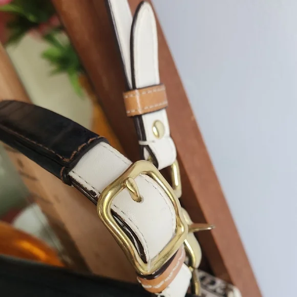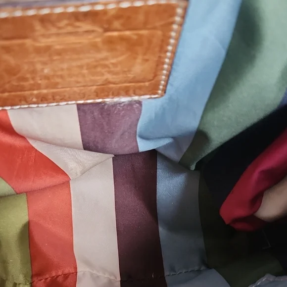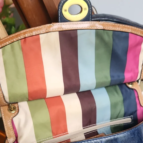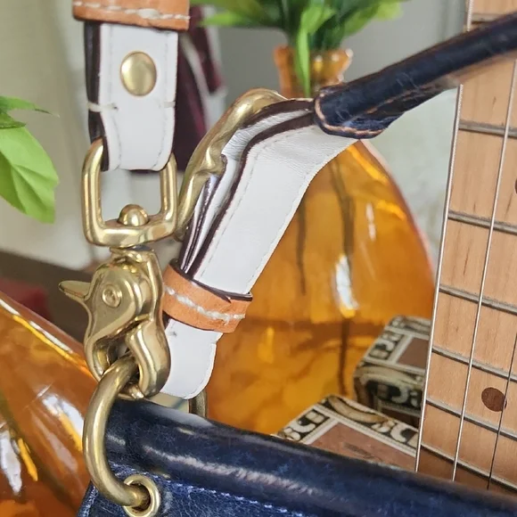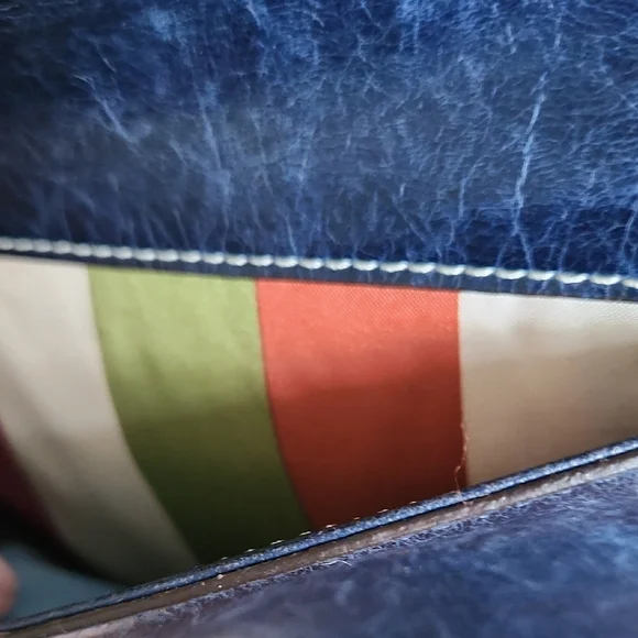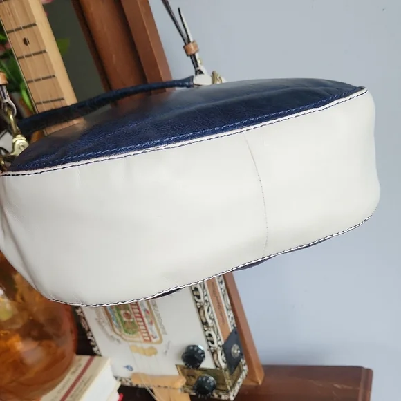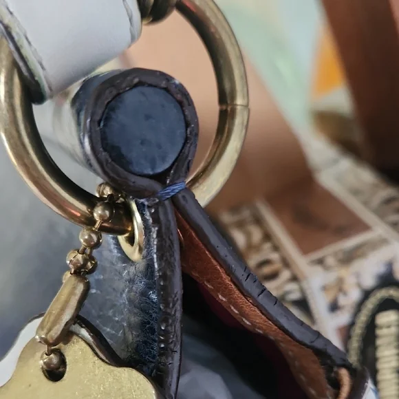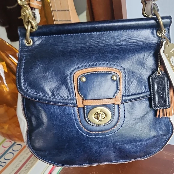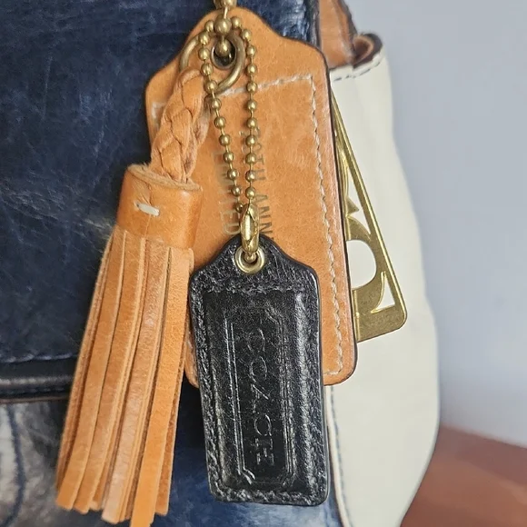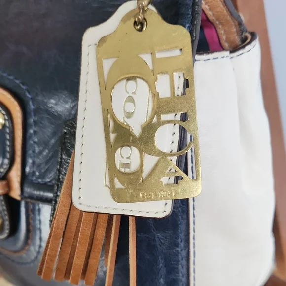 Limited edition 70th Anniversary Coach 19031 Legacy Willis Top Handle with Detachable Crossbody Strap. Super soft Navy Blue & White and Tan Leather color with brass hardware. Inside zip and multifunction pockets, exterior back pocket. Turn-lock closure, handle with 5" drop, and longer, detachable 23" drop leather strap for shoulder or crossbody wear. Beautiful colored striped fabric lining with some light adhesive staining on the inner flap seam.Details:- Fully Color-blocked Leather Exterior- Front flap- Single Top Handle- Hangtags galore (70th anniversary white and tan, small navy, metal coach and tan tassel)- Turnlock Closure- Detachable/ Adjustable Crossbody Strap- Back Slip Pocket on ExteriorInterior:- Fully lined with colorful stripe fabric- Leather Creed patch- Interior Pouch- Zip PocketPlease see the photos and video as they are part of the description, and I try to be super. There is some mild discoloration on the white bottom and adhesive staining on the interior flap. Some scratches on the hardwareThis is in VGUC- not a project. Cleaned with Lexol 1 and conditioned with Bick 4.Ask me any questions. Pet friendly non-smoking household.