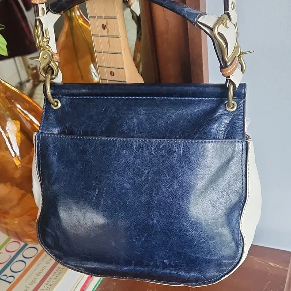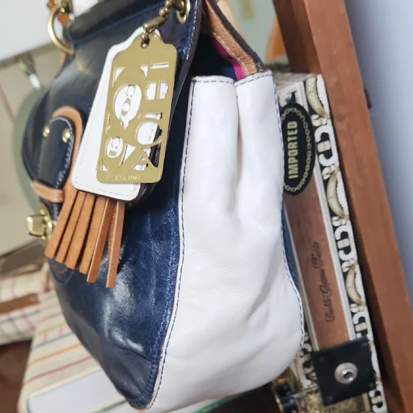 Limited edition 70th Anniversary Coach 19031 Legacy Willis Top Handle with Detachable Crossbody Strap. Super soft Navy Blue & White and Tan Leather color with brass hardware....