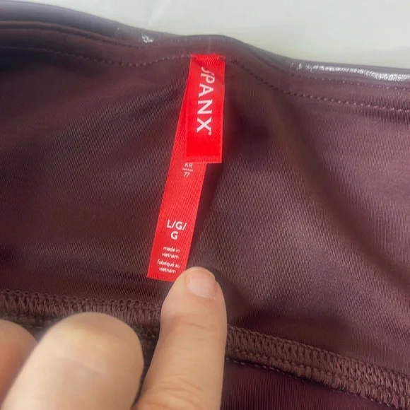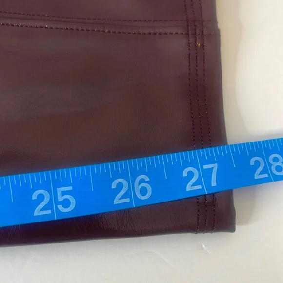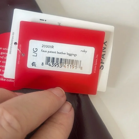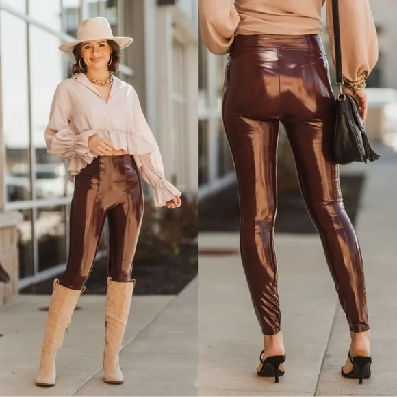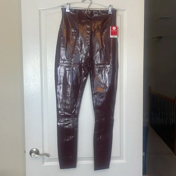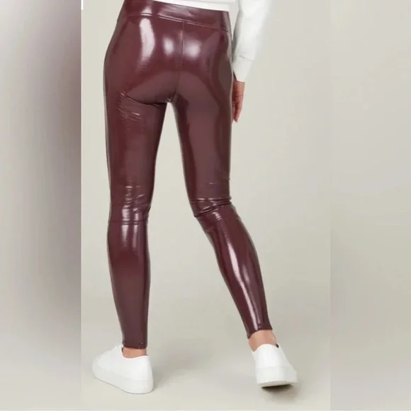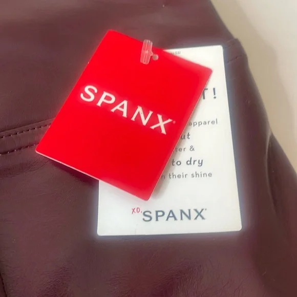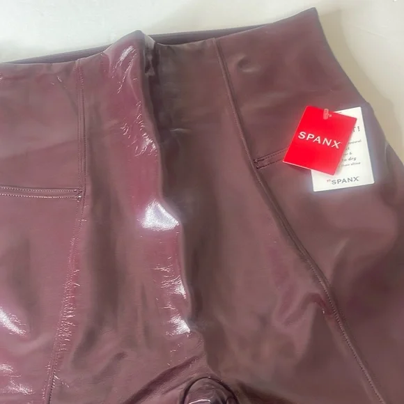 SPANX SPANXShape Faux Patent Leather Leggings Ruby Red LargeBrand new with tags. Excellent new condition. Shimmy it on! No button or zipper for a smooth lookContoured design for perky rearviewCenter seam free, no camel toe!Faux Leather that flatters. This style features high-shine, smoothing faux patent leather fabric and a hidden contoured waistband. This style was designed with a unique finish that gives them their rich color and shine. Hits at natural waist for great coverage and no muffin topFit Tip: These leggings may feel tight when you first put them on, but don’t worry, they will form to your body. We promise, they´re worth the SPANX shimmy!Inseams: Petite 25” (recommended for 5’4” and under), Regular 27", Tall 30" (recommended for 5’9” and above) when wornAnkle LengthDetailsHigh-shine, faux patent leather fabric shapes and liftsHidden core shaping technologyCenter-seam free for no more camel toeHigh-waisted designDress up or downInsider Tip: Like all patent leather, you may experience some squeakiness during wear. If this occurs, apply lotion or oil to the outside of the legging at the inne