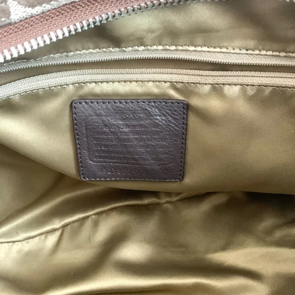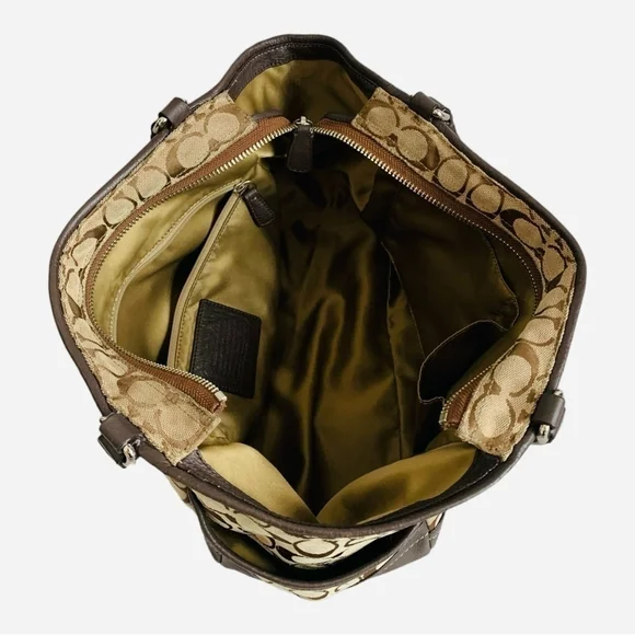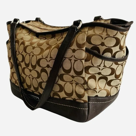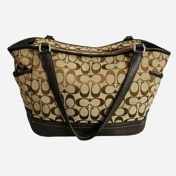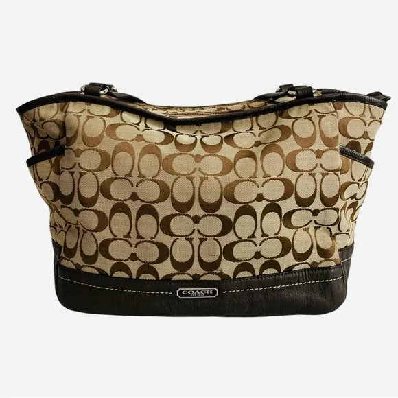 Discover the timeless elegance of the COACH Park Signature Tote, crafted in rich brown and tan canvas with genuine leather accents. This pre-loved handbag features a secure zip closure and boasts a spacious interior with 1 zip pocket and 2 multifunction pockets, perfect for organizing essentials. Exterior dimensions are approximately 17"L x 6"W x 9"H, with a comfortable 9.5" handle drop. The bag also includes 2 side exterior pockets for added convenience. Despite minor wear on the handles, the interior remains clean and ready for use. This #COACHBag is a stylish and practical choice for any fashion-forward individual. #WomensBag #ShoulderBag #HandBag #Tote #Purse #LeatherBag #BrownBag #SignatureBag. Materials: Canvas, genuine leather, polyester lining. Experience the quality and craftsmanship of #COACH with this versatile tote bag.#BestDeal