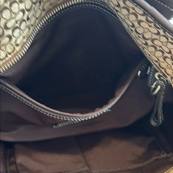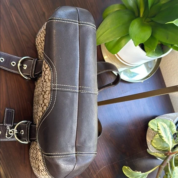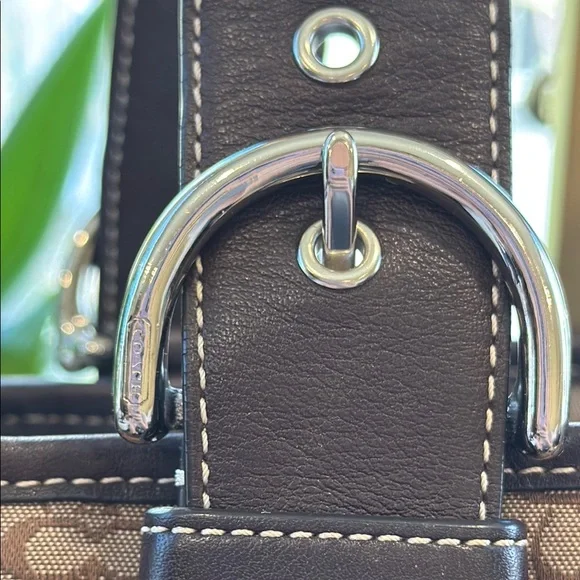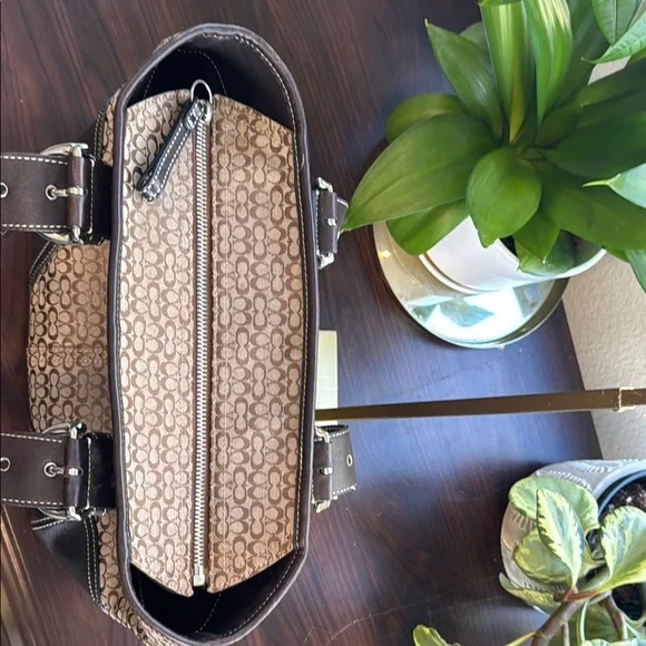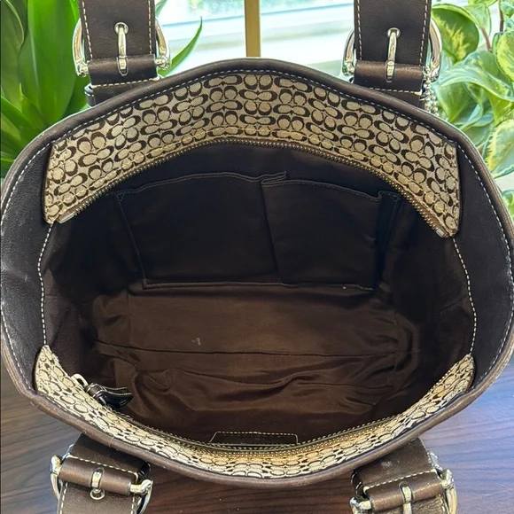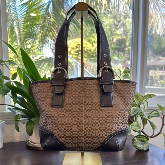 This elegant Coach tote showcases a harmonious blend of brown and silver hues, highlighted by its structured design. Crafted with attention to detail, it features sturdy handles and a spacious interior, making it an ideal choice for both style and functionality.