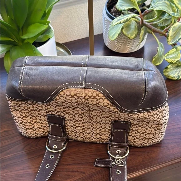 This elegant Coach tote showcases a harmonious blend of brown and silver hues, highlighted by its structured design. Crafted with attention to detail, it features sturdy handles...