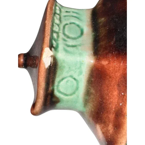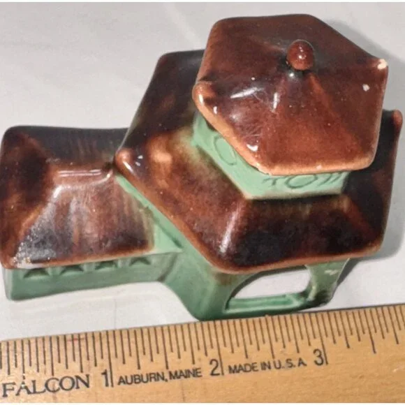 • Handcrafted ceramic material• Features intricate Asian-inspired pagoda design• Dual-tone green and brown glaze• Measures approximately 4" x 3" x 3"• Open windows for swim throughSmall glaze chip on the top corner, no other notable flaws. Top to bottom = 4 inches.