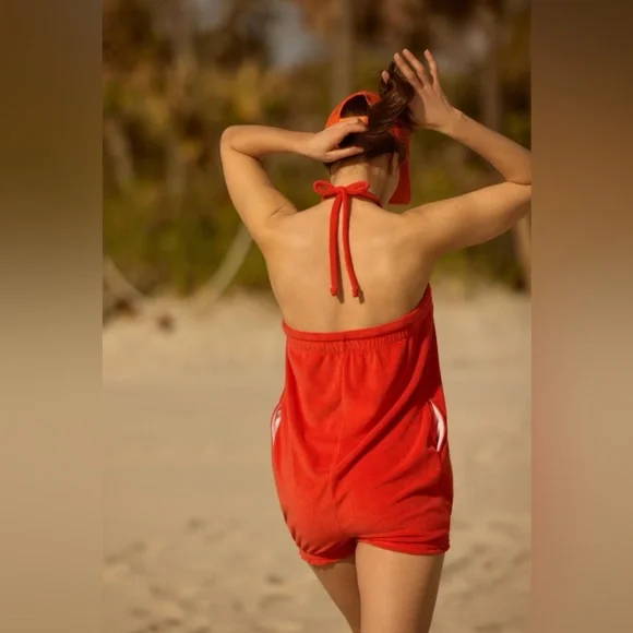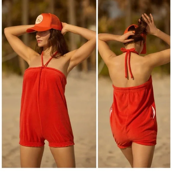 Chic red halter romper. Comes with a matching cap. Ideal for sunny outings.New without tags Terry cloth fabricTies around neck Side pockets