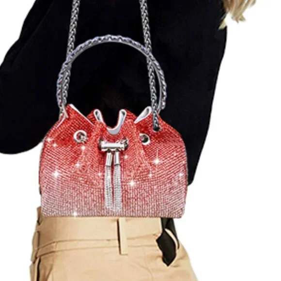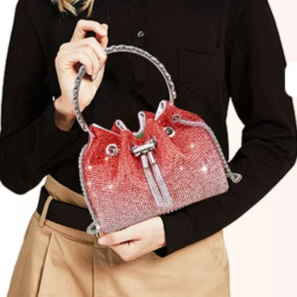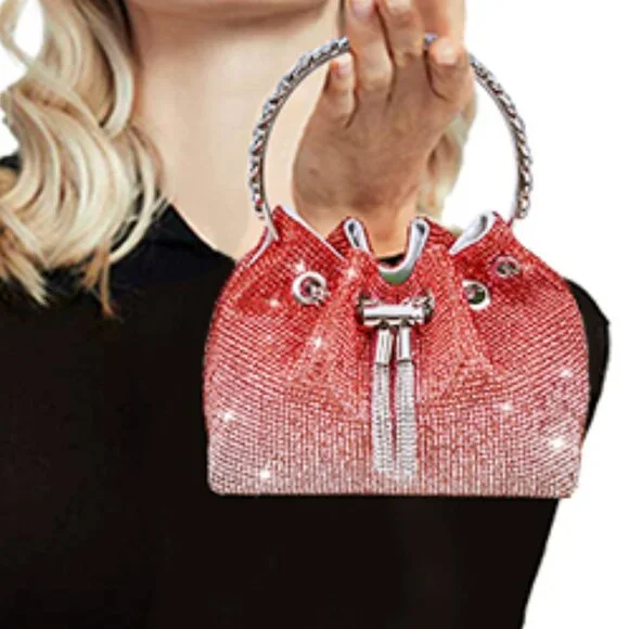Neiman Marcus Gradient Red Bling Crystal Rhinestone Purse The surface of the bag is made of 10,000 high-quality crystal rhinestones, and the inside is made of soft polyester, a trendy elegant luxury evening bag.6.7" x 4.3" x 5.9" / 17cm x 11cm x 15cm. This fashion shimmering rhinestone purse can hold your daily essentials like cell phone, lipstick, make ups, mini earphones, small wallet, sunglasses, keys etc.Protect your bag with a tassel hook & drawstring and tensioning the chain securely. The length of bling purse can be adjust you want, use it as a crossbody bag or shoulder bag; also use metal diamond handle as a clutch purse, handbag.This sparkly crossbody shoulder bag is perfect for social activites like evening, party, wedding, prom, festival events or just evening out. It will works very well with your outfit and jewelry, making you look a shining star in activity.Shipped out today!