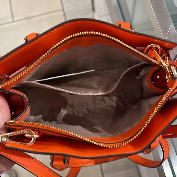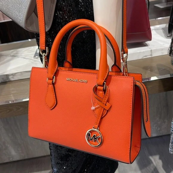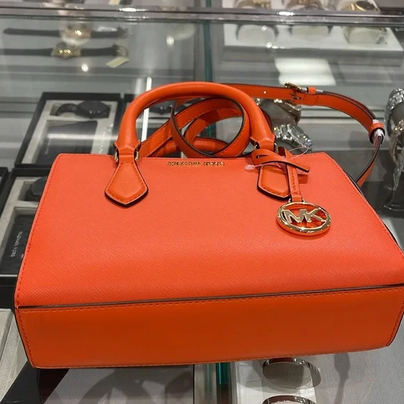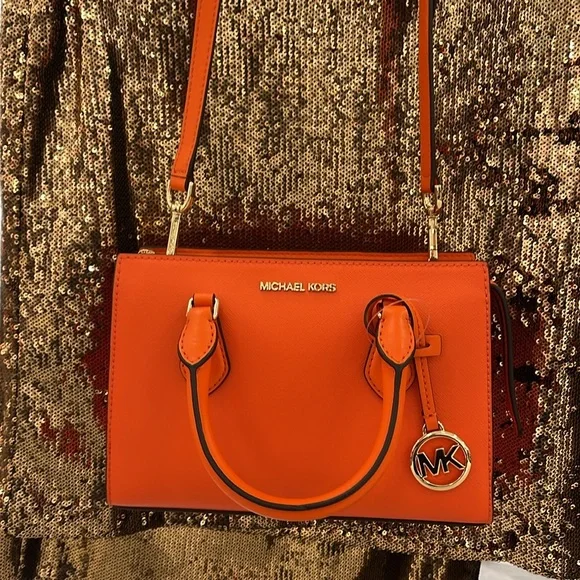 MICHAEL KORSSheila Small Faux Saffiano Leather SatchelPoppy NWT New with the tag authentic Day or night, the Sheila satchel is always chic and ready to go. This faux Saffiano leather bag is designed in a structured silhouette with a zip closure for added security and a slip pocket inside for your cardholder or phone. Carry it by the elegant top handle, or attach the included shoulder strap to wear it crossbody.• Satchel • Faux leather • 88.92% coated canvas/11.08% polyester • Gold-tone hardware • 9.25"W X 6.25"H X 3.5"D • Handle drop: 3.5” • Interior details: back slip pocket • Lining: 100% polyester • Zip fastening • Imported • Style # 35S3S6HS5L
