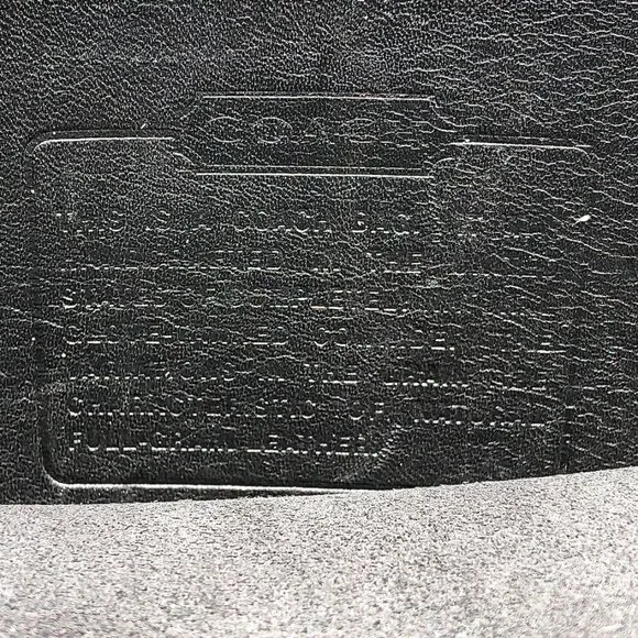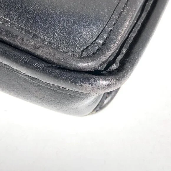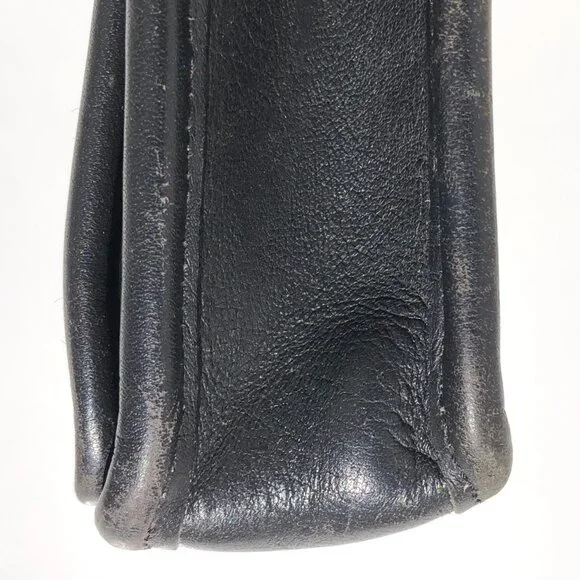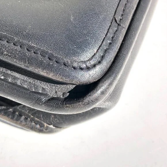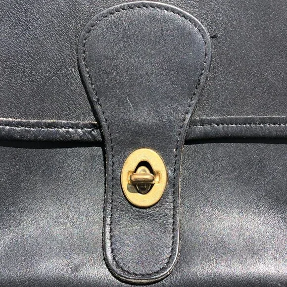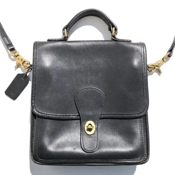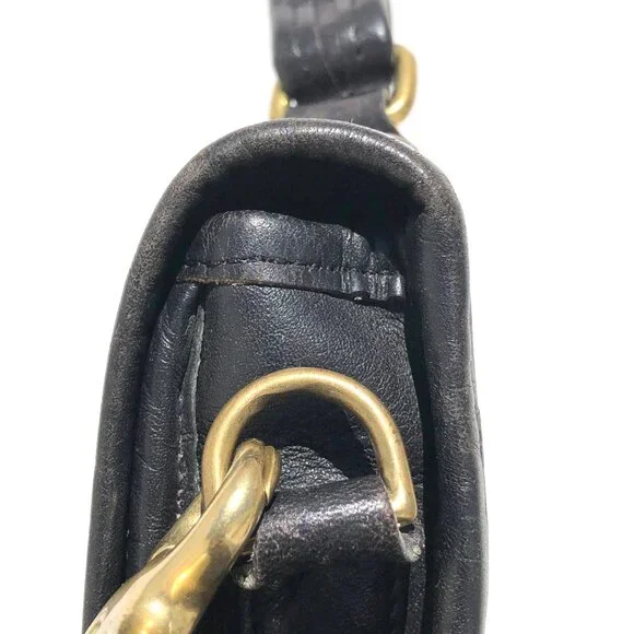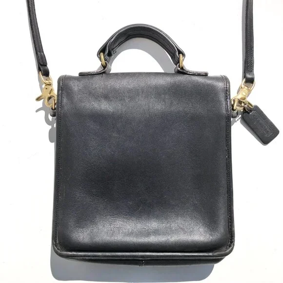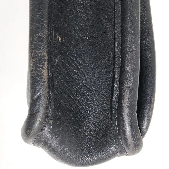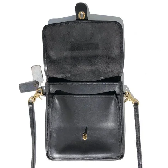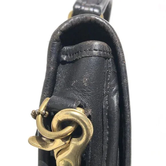 COACH vintage Station Bag 5130 black leather purse handbag crossbody Made in USA.black leather with brass hardware.removable strap.turnlock closure.vintage Coach Made in USA.body of bag (not including handles) outer measurements: 9 inches wide, 9.5 inches tall, 2 inches deep.handle drop 2.5 inches.strap drop 20.5 inches.condition: in good pre-owned vintage condition, typical use wear as seen in photos, hang tag leather has come unglued, please note rectangular shaped texture difference on leather inside of flap (not a shadow from photography).Inventory A.