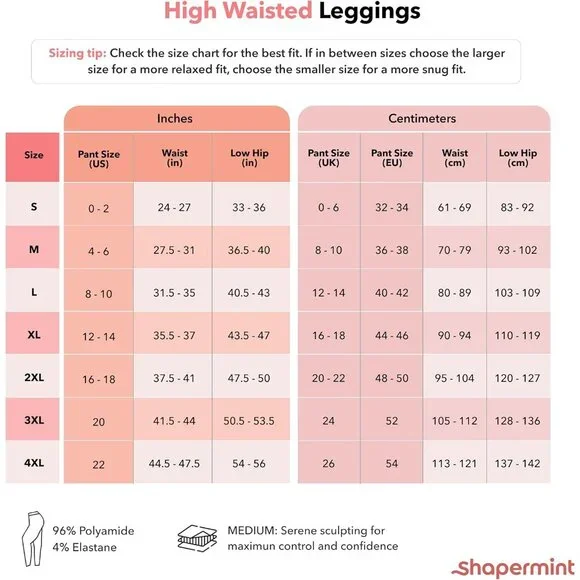 SHAPERMINT WOMEN´S LEGGINGS FIT SIZES: 18 - 20 | Waist: 39 - 42 in, Low Hip: 48.5 - 52 inSIZING TIP: Runs small. Considering size up!NON-SEE THROUGH FABRIC: Made from 96%...