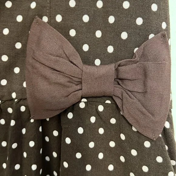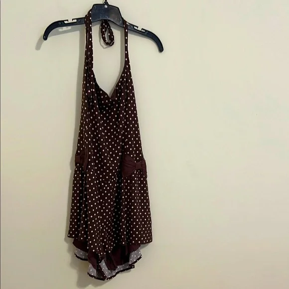 Chic brown halter romper with white polka dots. Features a stylish bow detail.Lay flat bust 18”Waist 17”Length 27” with adjustable strap New without tag