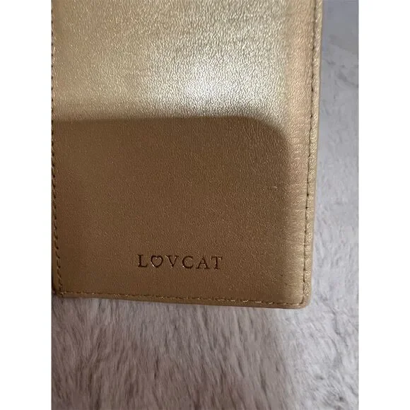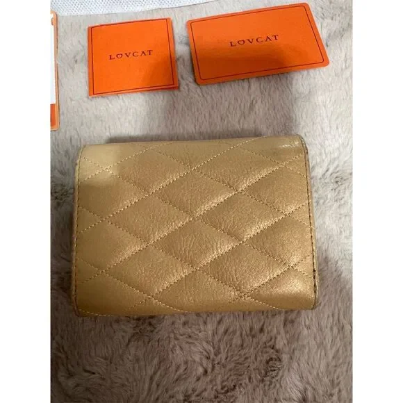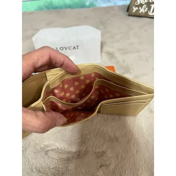 The Lovcat Paris trifold wallet in shimmering gold leather is a chic accessory for any occasion, from a casual brunch to an elegant evening out. Its sleek design features a subtle logo accent, adding a touch of sophistication to your ensemble. Inside, you´ll find ample space to keep your essentials organized, with dedicated slots for credit cards and a spacious compartment for cash. This wallet is not just a stylish statement but a practical companion for your daily adventures. New with tags.Keywords: Lovcat Paris, gold wallet, women´s wallet, trifold wallet, leather wallet, credit card slots, logo accent, solid pattern, stylish accessory, new with tags.Brand: Lovcat ParisType: WalletColor: GoldDepartment: WomenStyle: TrifoldFeatures: Credit CardMaterial: LeatherAccents: LogoPattern: Solid