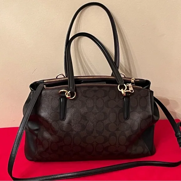 Coach Christie Logo Detailed Double Zip Carryall Brown/Black Signature Coated Canvas and Leather Mini Bag Satchel. This beautiful Christie bag from Coach is highly functional...
