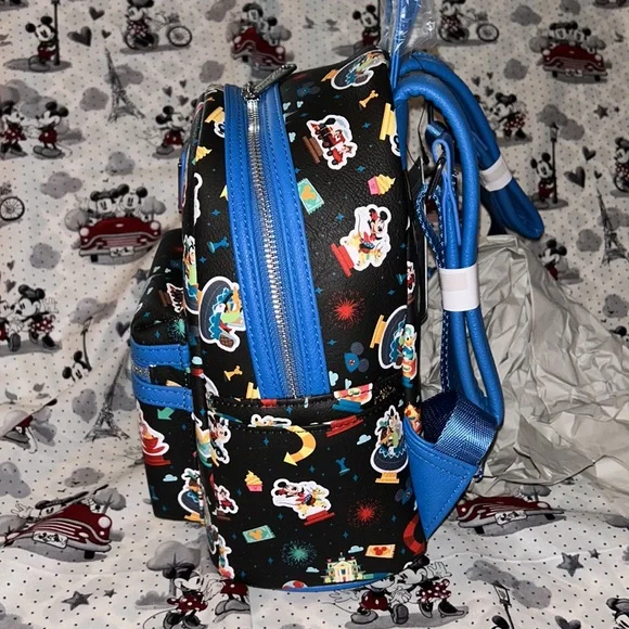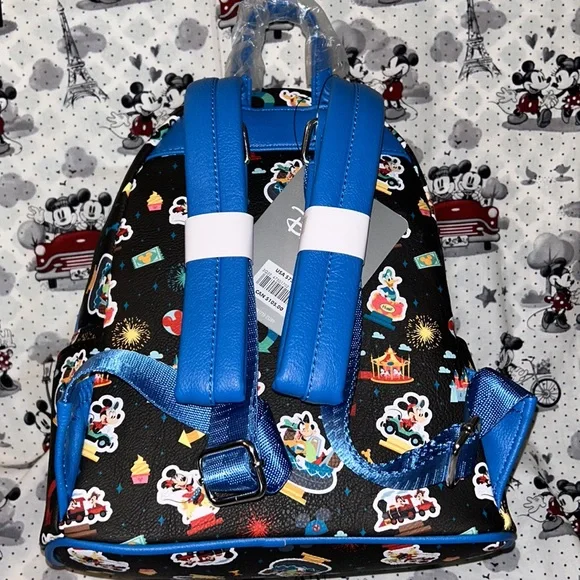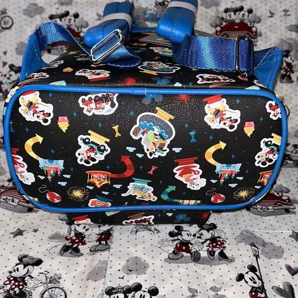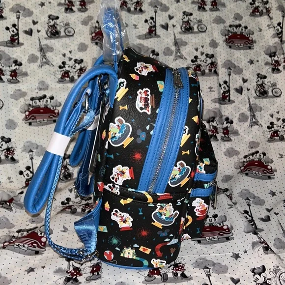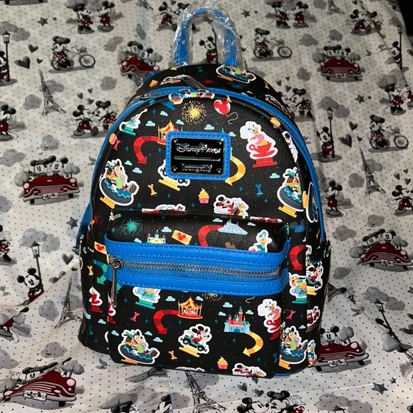 NWT Disney park rides Loungefly mini backpack. Cute backpack with Mickey and friends on the various rides from the parks. No longer available. Beautiful colors and print.