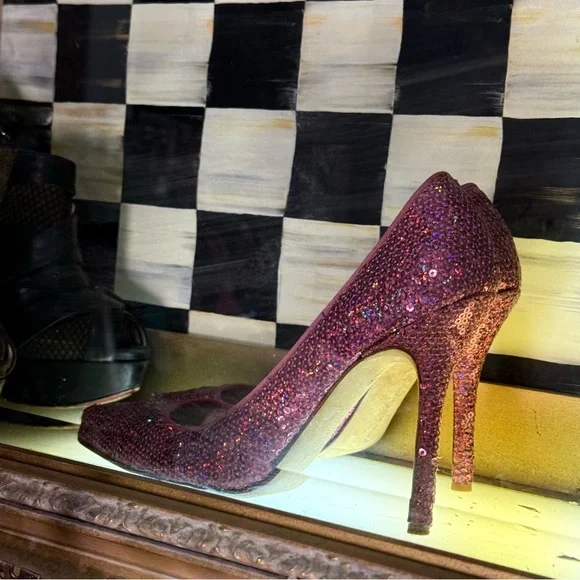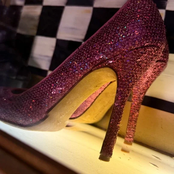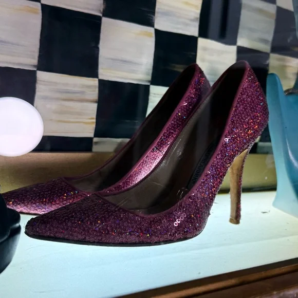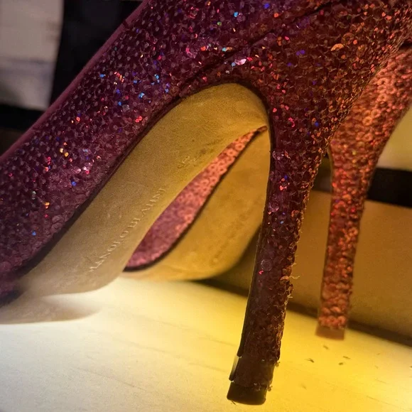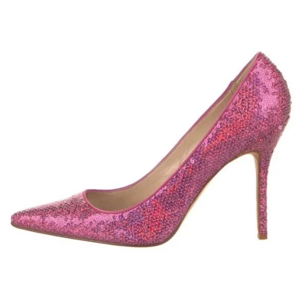Elevate your style with these exquisite Manolo Blahnik heels, crafted in a striking pink hue. The sleek stiletto design and pointed toe offer a sophisticated silhouette, perfect for making a statement at any formal event.The last few pictures where the pumps are behind, the glass are the actual pair that I have. There are some sequences missing at the very tip of the toe, but you can easily find matching sequins at Michael’s and glue them on. It’s not noticeable unless you kneel down and stared at them.These are by far my most favorite pair of heels, but I have hundreds of Louboutin heels, Jimmy shoes and melo’s and since I haven’t worn these in forever, I have to say goodbye.Because of the volume of shoes I have I always keep them in a rotation, but I have worn these probably 10 times.