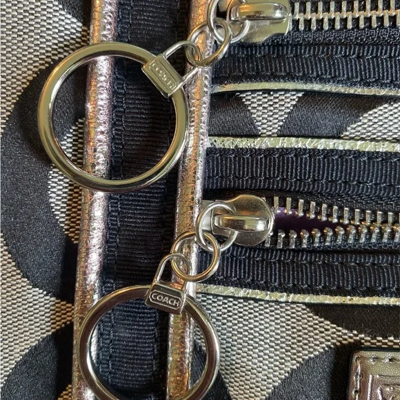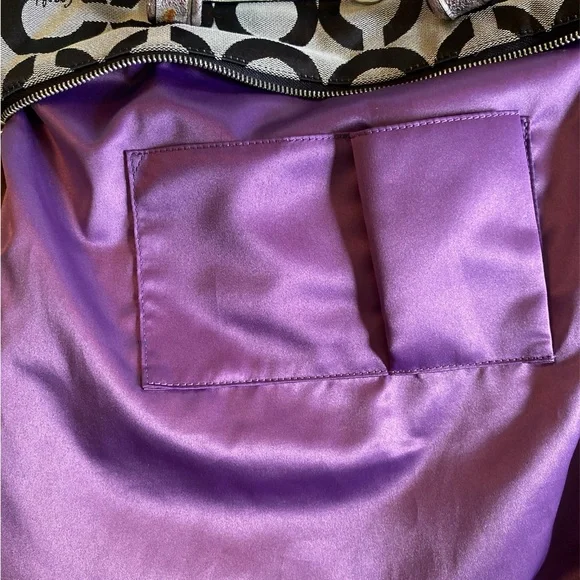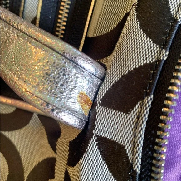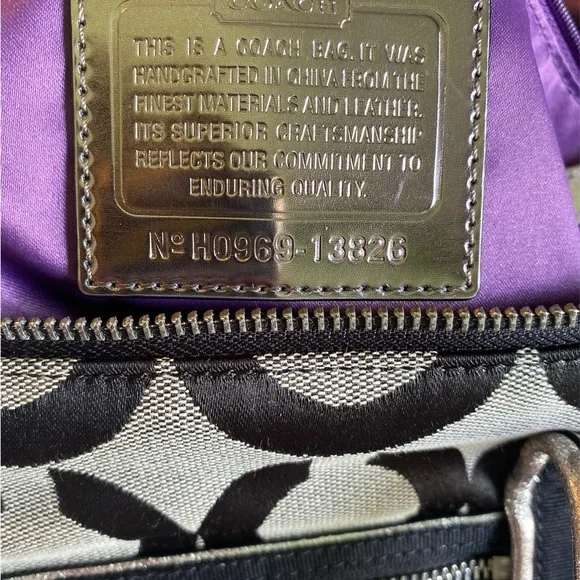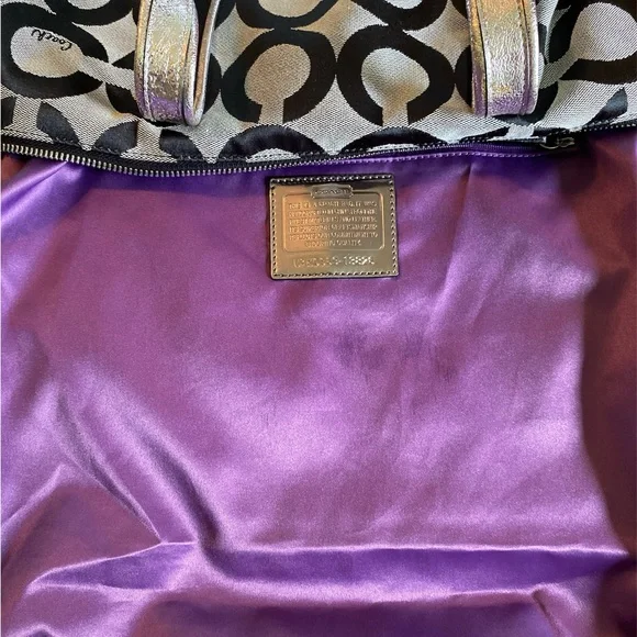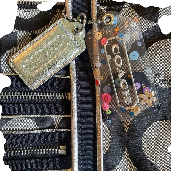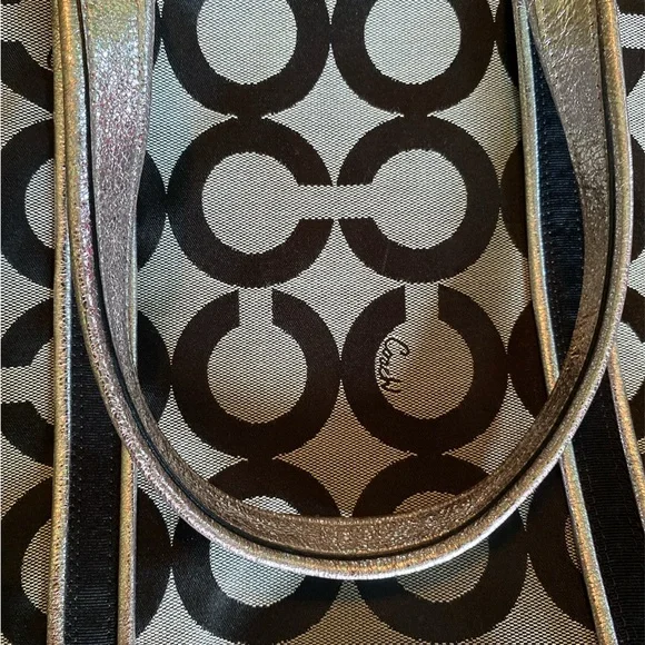 This sophisticated Coach tote bag features a striking geometric pattern in black and gray, complemented by leather trim and double handles. Its structured design and medium size make it perfect for everyday use, while the metallic nameplate adds a touch of elegance.EUC-has been cleaned, lining is clean, no rips, stains or odors. Handles are good, one spot as noted in pictures. Offers are welcome Callout * please note spot on handle15” x 14”Handles 8.5 drop