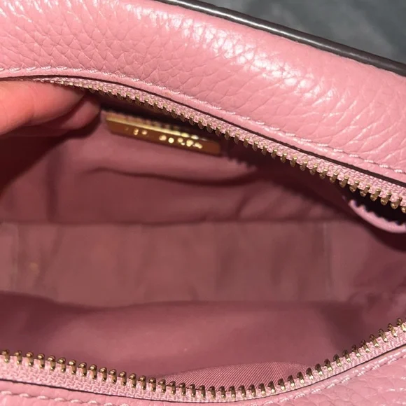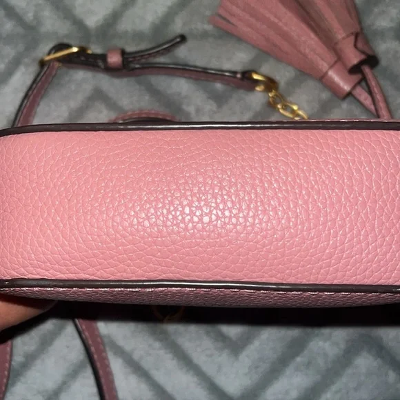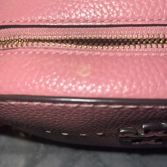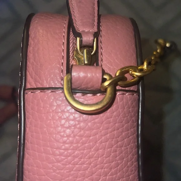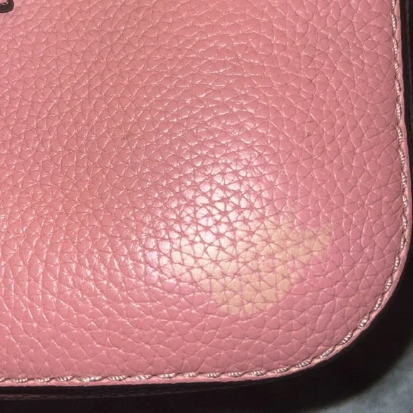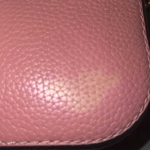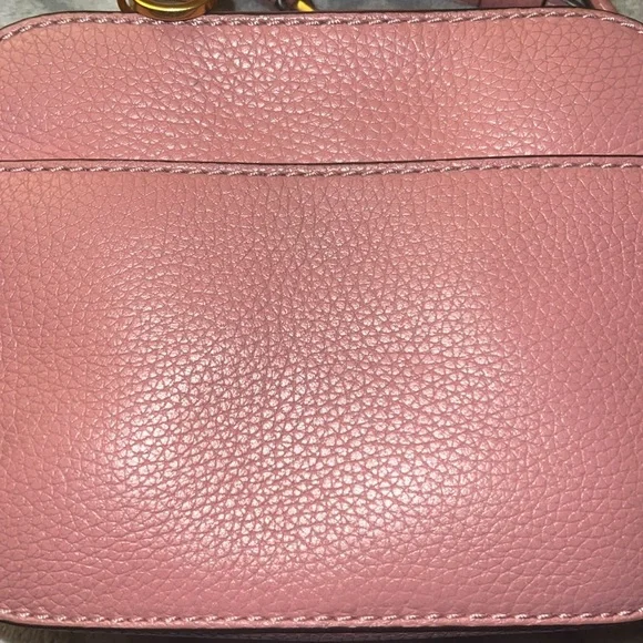 Logo appliqués add subtle signature style to a structured camera bag shaped from richly pebbled leather. Used but in great used condition. No stain in the interior however there is stain in the front. Please reference photos.8"W x 6"H x 2 ½"D. (Interior capacity) 21 ½" – 23" crossbody strap drop.