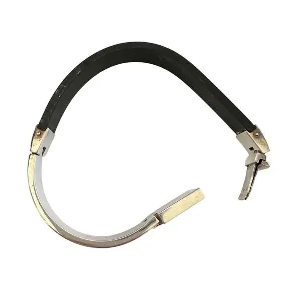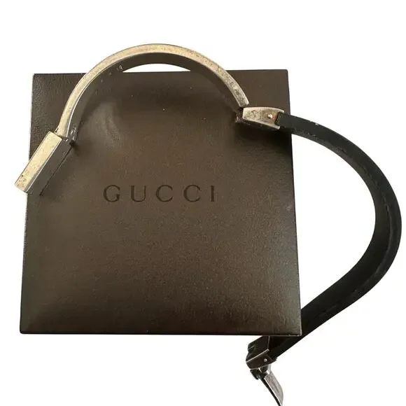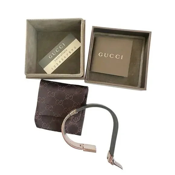 ID bracelet. Sterling silver hardware with rubber band. Brown cube box, Velvet GG Logo dust bag, care instructions and card included. Some dings / wear to finish on hardware but overall very good. Please look closely at photos for best depiction of details. Approx 7.5" long