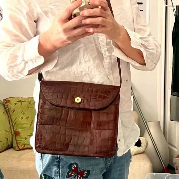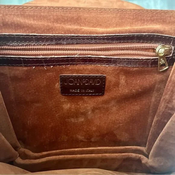 Vintage Joan & David Brown Leather Crocodile Alligator Suede Lining Crossbody Bag This vintage classic timelessshoulder bag from Joan & David is a must-have for any fashion-conscious woman. Made from high-quality brown alligator leather , this bag is both stylish and durable. The crocodile/alligator pattern adds a touch of sophistication and makes it a perfect accessory for any occasion. The spacious interior provides ample storage space for all your essentials, while the sturdy shoulder strap ensures comfortable carrying. Ideal for everyday use or special events, this bag is sure to turn heads wherever you go.