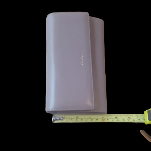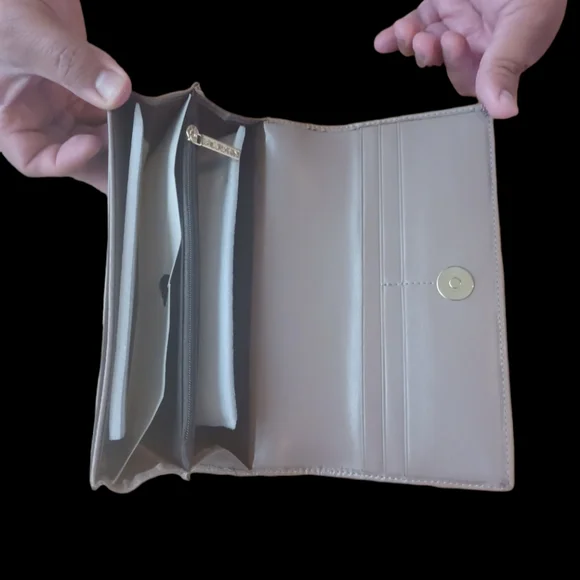 New with no tags, tan color with many opening for credit cards and easy access. Zipper logo with gold color, and opening on the back for receipts.