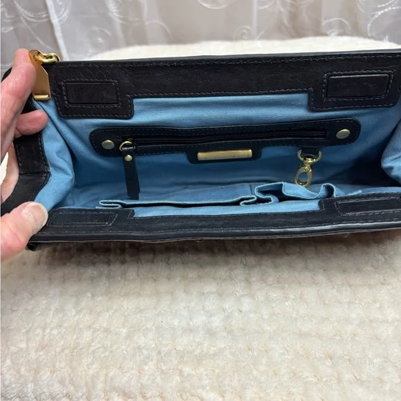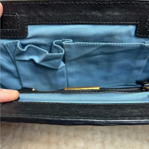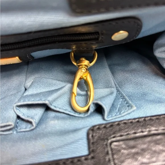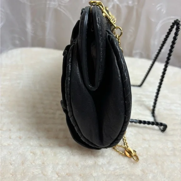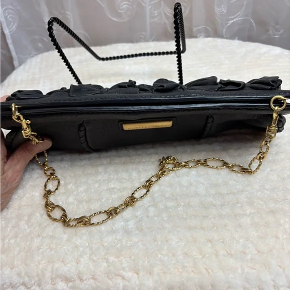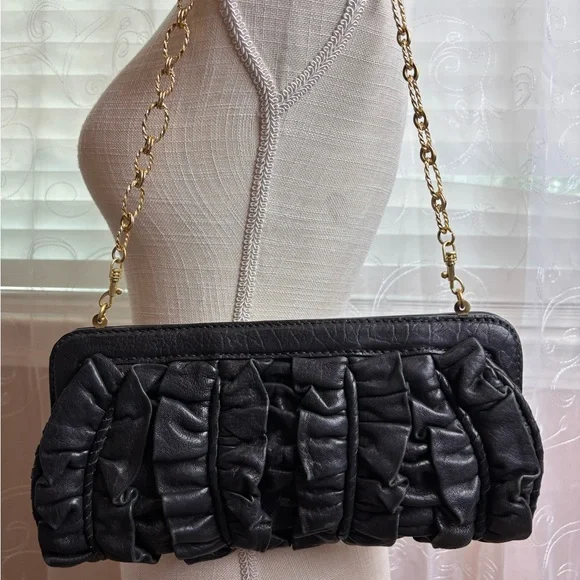 Retail $395Genuine black leather outer with a “twist “ on backGold tone name plate on front with ever so slight scratching, see photos Beautiful gold tone intricate shoulder...