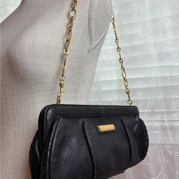 Retail $395Genuine black leather outer with a “twist “ on backGold tone name plate on front with ever so slight scratching, see photos Beautiful gold tone intricate shoulder chainMagnetic closure Interior has side zip pocket, 2 slip pockets, and key holderPerfect size for the essentials Elegant luxury!Thanks for shopping:)072825