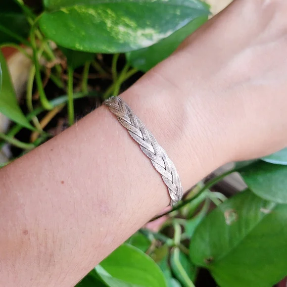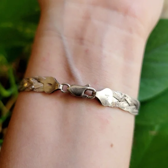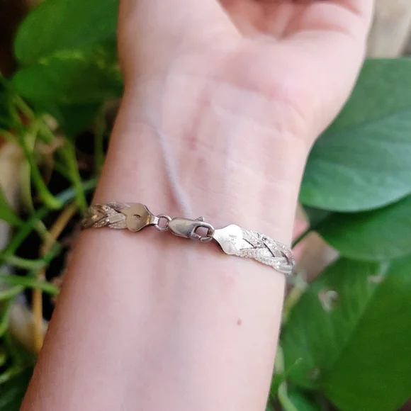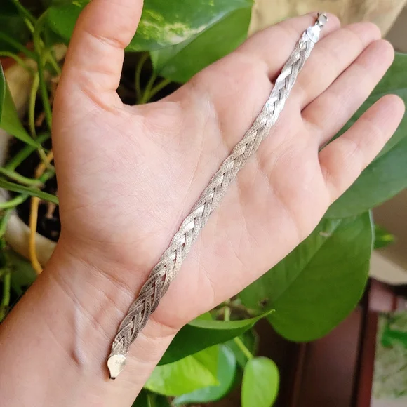 Vintage Dainty 925 Sterling Silver Italian Braided Herringbone Woven Chain Bracelet & Anklet. Approx 6.5" around. Beautiful...._____boho bohemian vintage stock unworn new nwot without tags aged estate jewelry intricate carved handmade handcarved art dainty petit petite small chain thin bracelets fine twist vintage estate twist weave braid jewelry sbbSLP