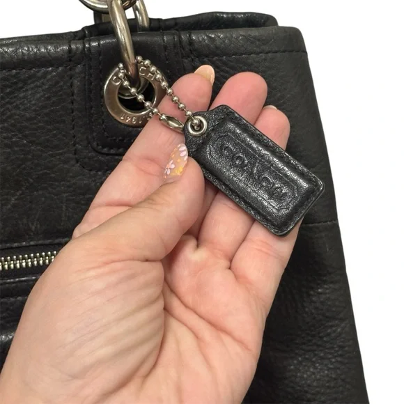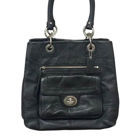 This Coach Y2K Vintage Hampton Black pebbled leather purse features a classic rectangular shape with a turn lock closure and brass hardware accents. The medium-sized bag has...