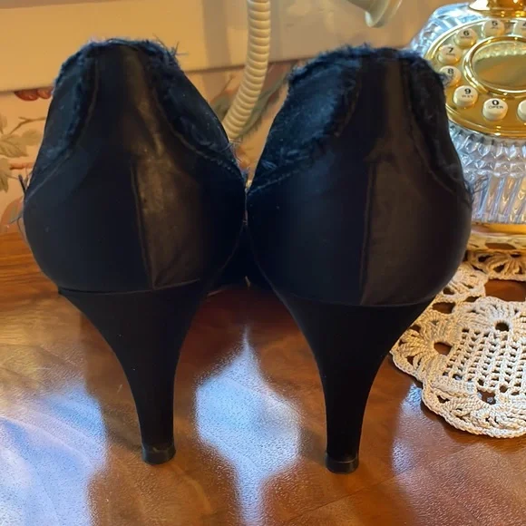 Gorgeous for day or night.Black satin. Open toe embellished with black beads. This is a timeless and classic pump. Pretty.Feminine. Comfortable.Gently worn. Excellent condition. Size 10Approx 4” heel.