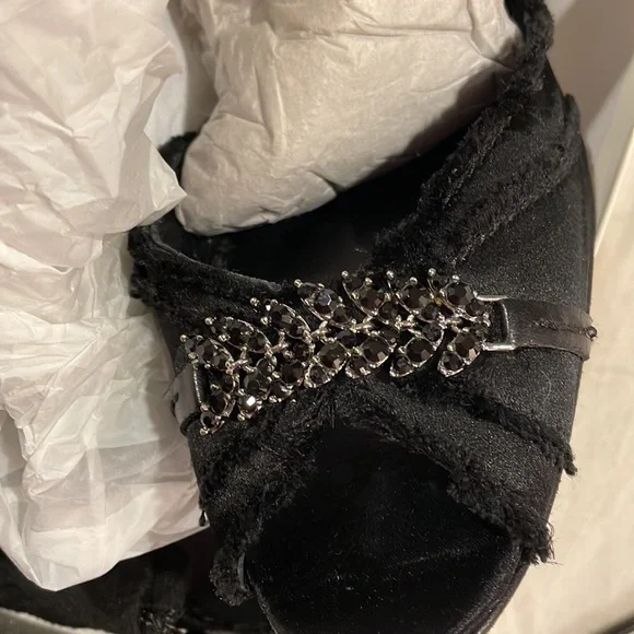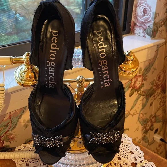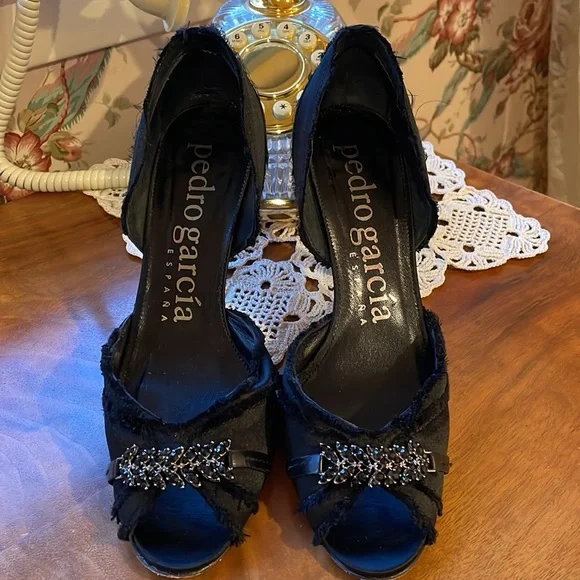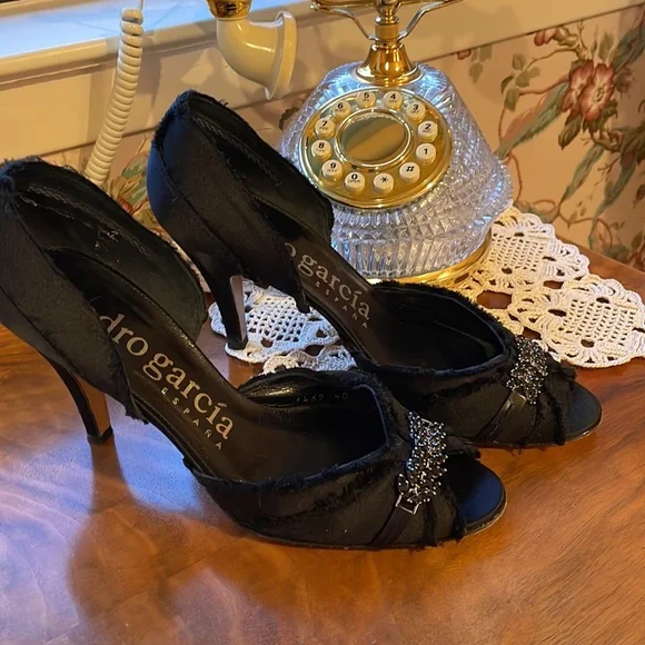 Gorgeous for day or night.Black satin. Open toe embellished with black beads. This is a timeless and classic pump. Pretty.Feminine. Comfortable.Gently worn. Excellent condition....
