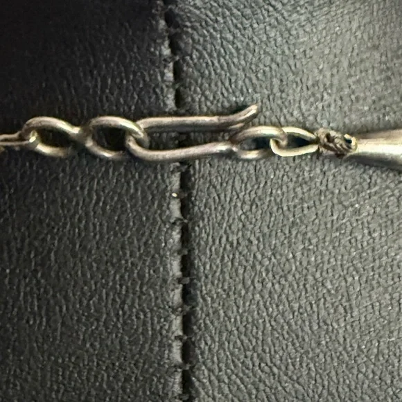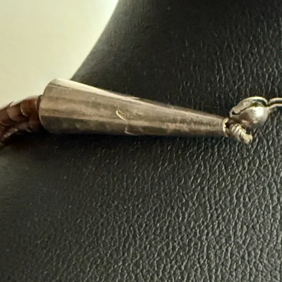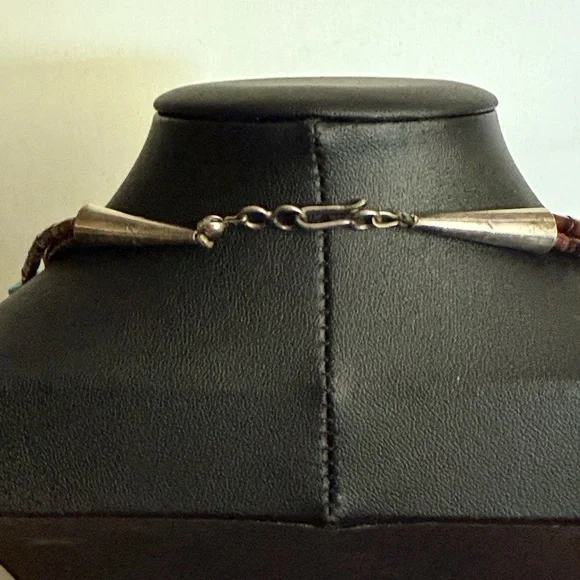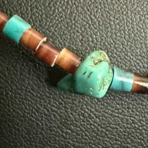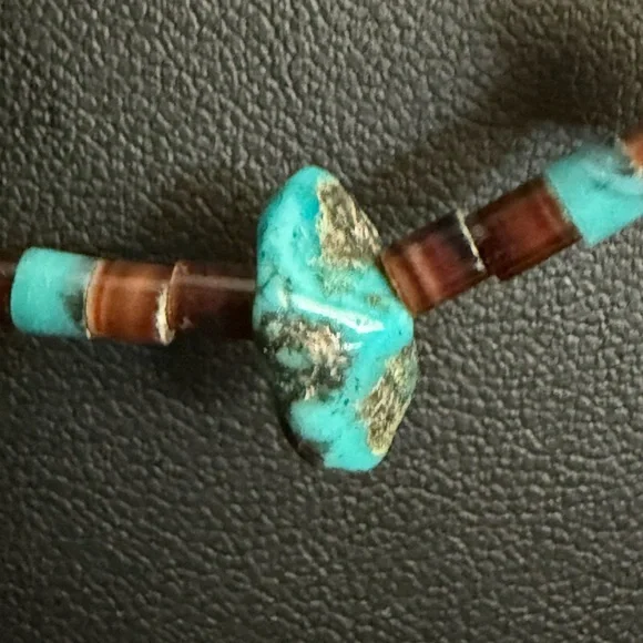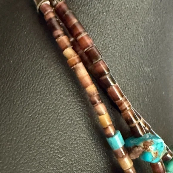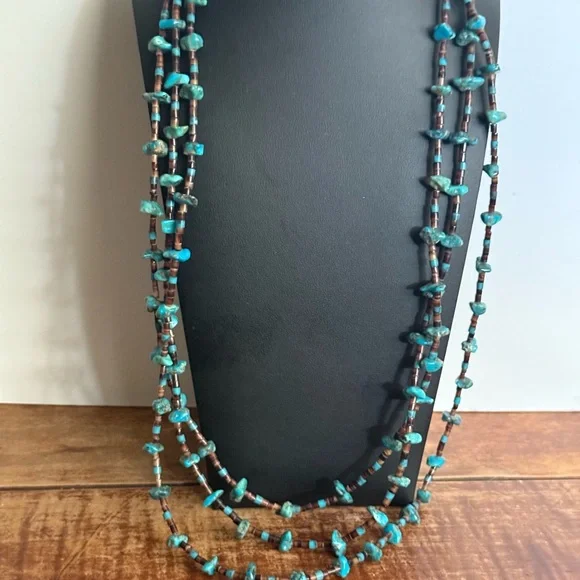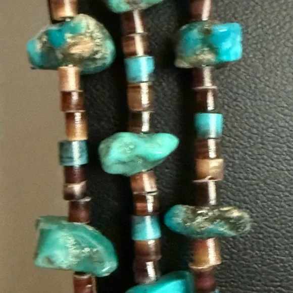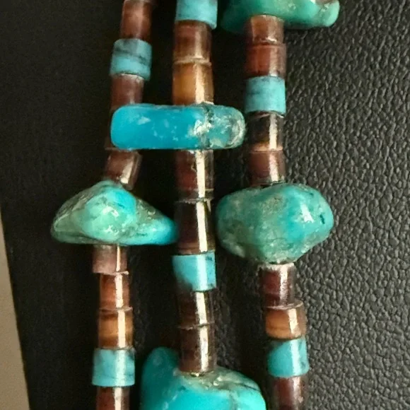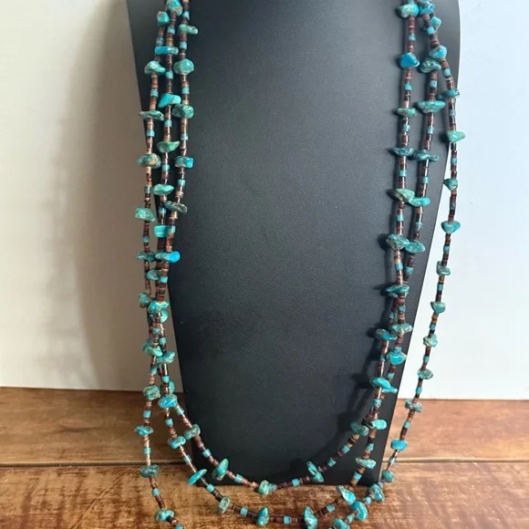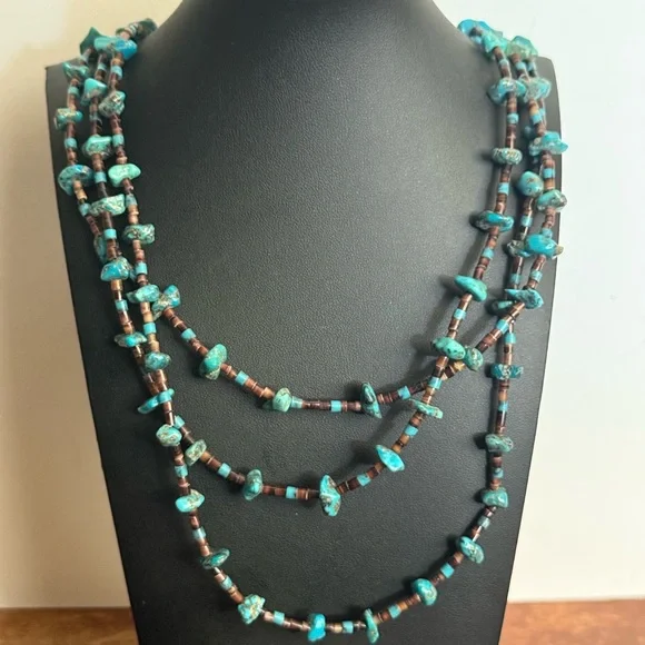 This exquisite necklace features three strands of turquoise and brown beads, artfully layered for a striking effect. The irregular turquoise stones add a natural touch, while the brown beads provide a warm contrast. Perfect for adding a unique flair to any ensemble. Triple strand vintage necklace, longest being approximately 30” Sterling 925 findings