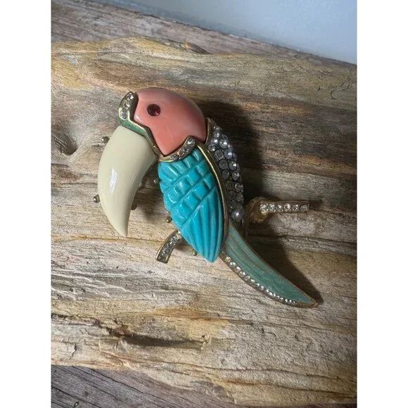 Fabulous Hattie Carnegie toucan bird pin brooch. The pin is gold tone metal with coral, turquoise and off white resin or think plastic material, clear glass rhinestones and...